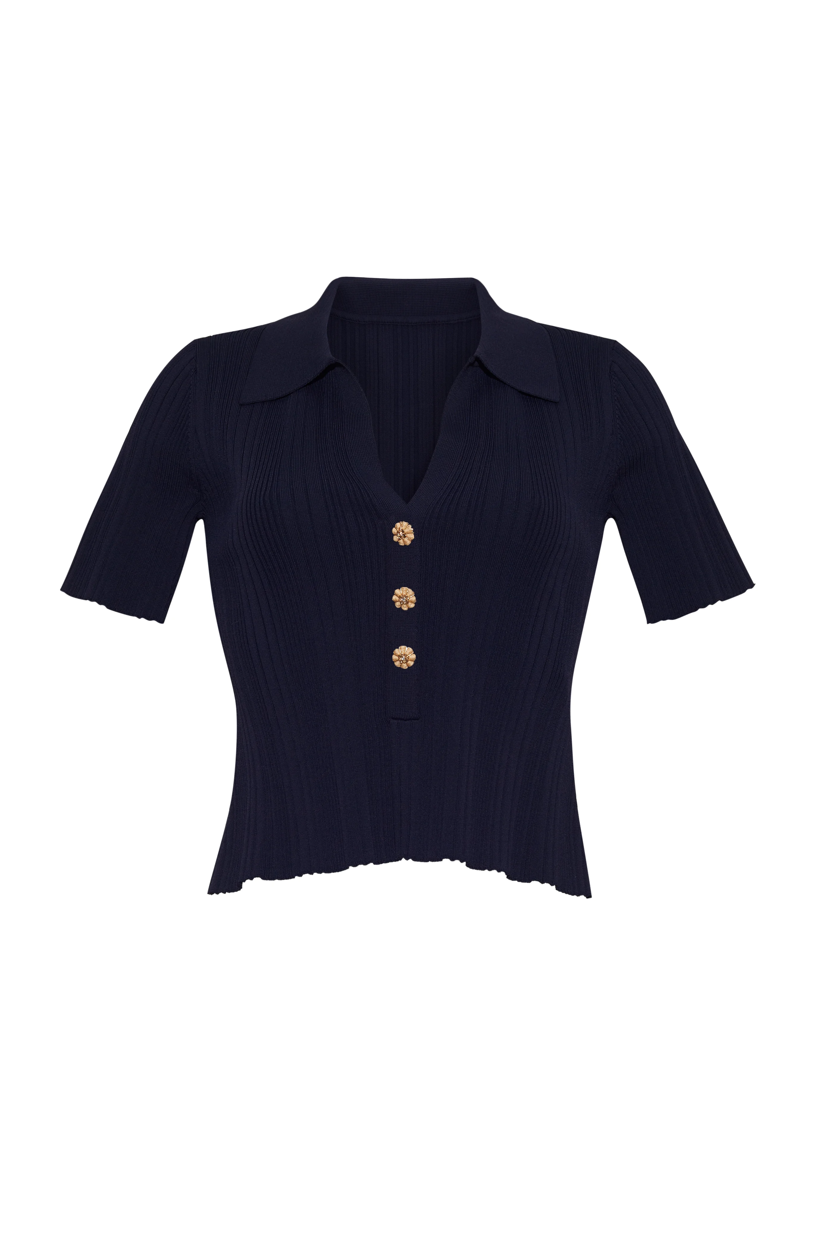 • Short sleeve rib knit polo with novelty raffia buttons Details • 72% Viscose 27% Nylon 1% Spandex • Dry Clean Only or Hand Wash Cold • Made in China