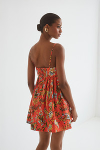 • Mini length babydoll dress designed for a fit-and-flare look • Fitted at bodice with boning at side seams • Nipped in at waist and voluminous skirt flares out • Square neck with adjustable spaghetti straps • Center back zipper opening with hook-and-eye closure • Functional side seam pockets • Hem features decorative top stitch seam detail • Bodice is fully lined in cotton voile • Allover print • Smocked center back panel Details • 100% Cotton Poplin • Dry Clean Only or Hand Wash Cold • Made in India