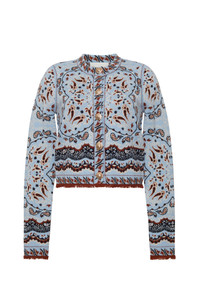 • Novelty gold snaps • Fitted boxy shape • Novelty birdseye bandana jacquard patterned knit • Long sleeve with fringe detail at cuff and bottom hem This garment is special and might stretch over time if hung. To preserve its shape, we recommend taking extra care and folding. Details • 55% Extra Fine Merino Wool 45% Cotton • Dry Clean Only or Hand Wash Cold • Made in China