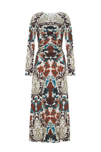 The Maisy Dress emulates chic freshness with a bold print. Rendered in slinky jersey, this flattering A-line midi’s ruched bodice and lean sleeves offer day-into-cocktail versatility for every occasion. • Slinky jersey • Invisible back zip with hook-and-eye closure • Shirred ruching at center front, center back and side-seams • Placed print This garment is special and might stretch over time if hung. To preserve its shape, we recommend taking extra care and folding. Details • Slinky Jersey 93% Viscose 7% Spandex • Dry Clean Only or Hand Wash Cold • Made in China