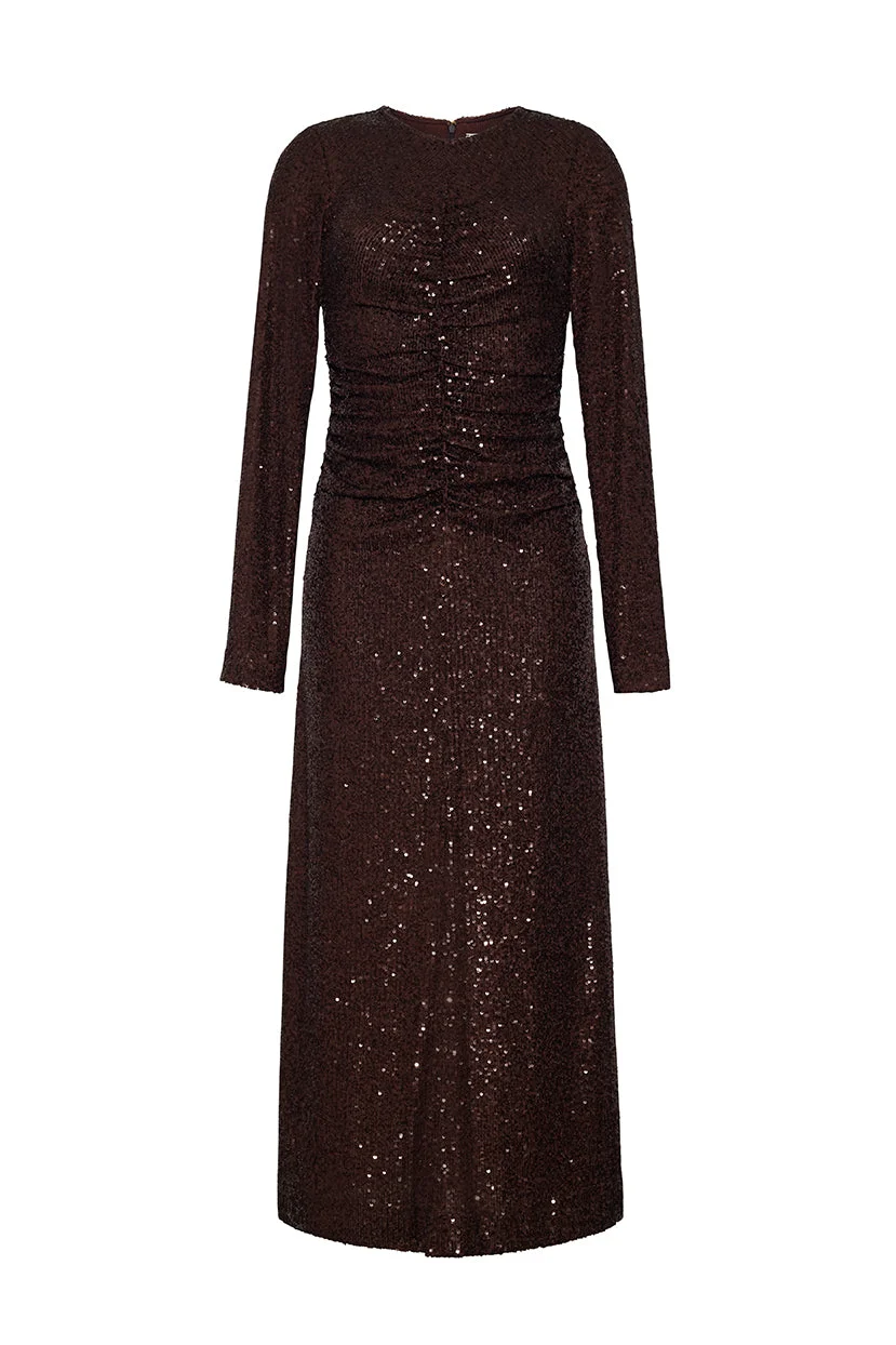 The Maisy Dress emulates chic freshness with a bold brown sequin. • A-line midi with ruched bodice and lean sleeves • Sequin mesh with mesh lining • Invisible back zip with hook-and-eye closure • Shirred ruching at center front, center back and side-seams This garment is special and might stretch over time if hung. To preserve its shape, we recommend taking extra care and folding. Details • 97% Poly 3% Spandex • Dry Clean Only or Hand Wash Cold • Made in China