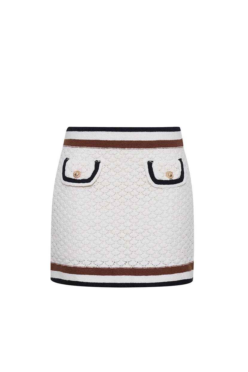 • Allover pointelle mini skirt with striped trims • Nonfunctional pocket flats with decorative gold buttons • Fully lined • Pull on style This garment is special and might stretch over time if hung. To preserve its shape, we recommend taking extra care and folding. Details • 100% Cotton • Dry Clean Only or Hand Wash Cold • Made in China
