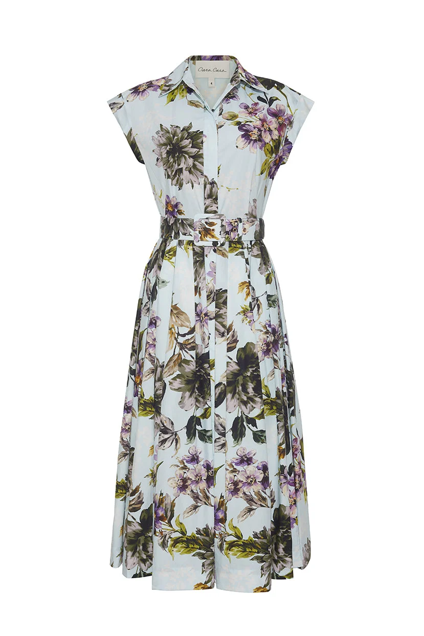 • Drop-shoulder, fit-and-flare, midi, belted shirtdress • Rolled, self banded sleeve • Center front button down placket opening • Separate self covered belt with square buckle • Belt has decorative top stitching detail • Side-seam pocket bags • Unlined skirt has variegated box pleats • Darts at front and back bodice for a fitted look • Collared • Unlined Details • 100% Cotton Poplin • Dry Clean Only or Hand Wash Cold • Made in China