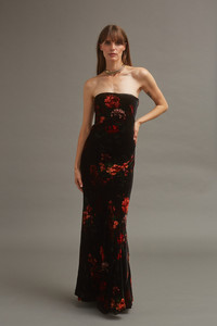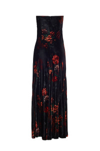 • Strapless paneled velvet maxi dress with internal power mesh corset construction • Fully lined • Center back seam with an invisible zipper and hook-and-eye closure at top opening • Allover print Details • 82% Rayon 18% Silk • Dry Clean Only or Hand Wash Cold • Made in China