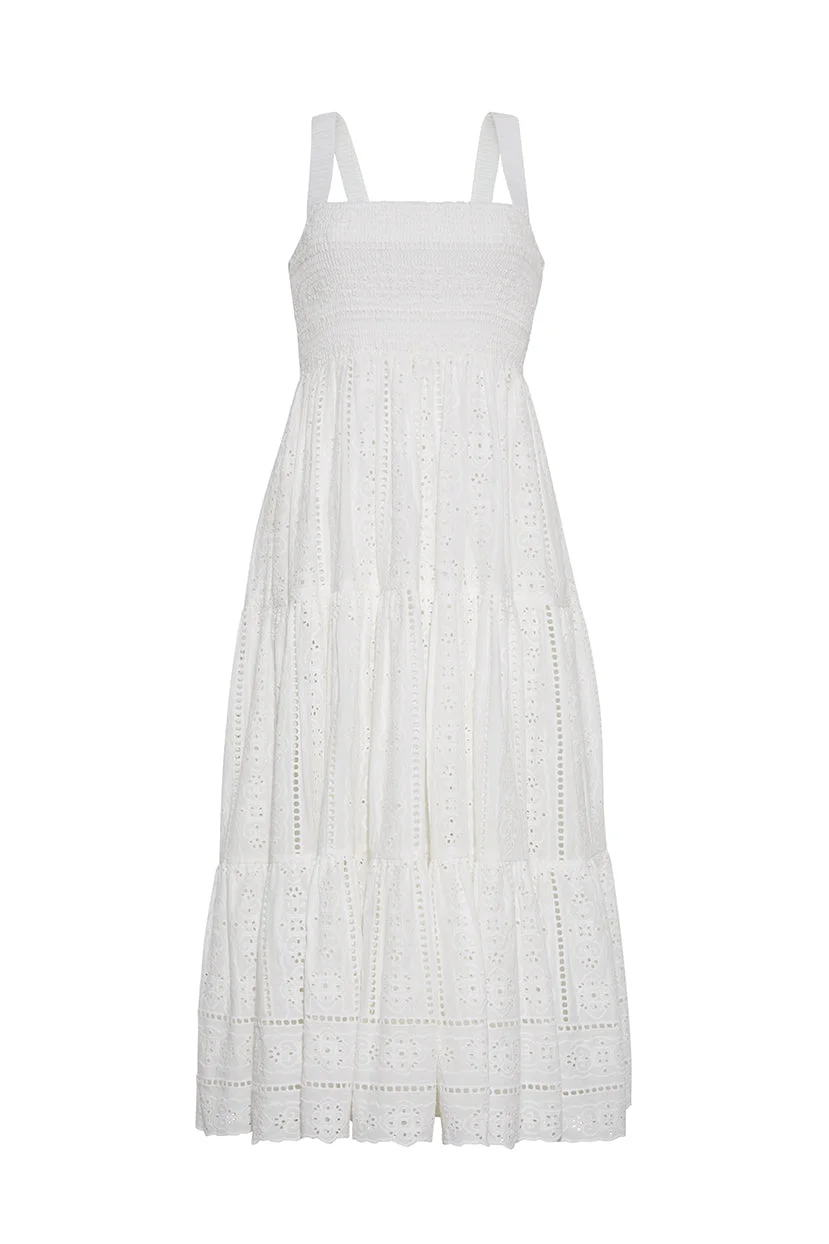 • Smocked midi dress with tiered skirt • Fully elasticated straps for adjustability • Designed for a fit-and-flare look • Functional side seam pocket bags • Fully lined • Internal elastic at neckline and waist for adjustability • Straps meet at center back neck • Tiered skirt with gathers • Garment features scallop detail at hem Details • 100% Cotton Eyelet, 100% Cotton Voile Lining • Dry Clean Only or Hand Wash Cold • Made in China