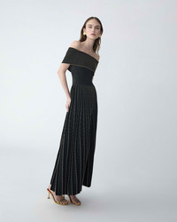This off-shoulder knit dress shimmers with degrade gold beads that flow across the neckline and down the pleated skirt, creating a luminous, dimensional effect. Style it with gold jewelry or heels to enhance its opulent finish. Off-shoulder neckline SKU R2612E505KBR SIZE & FIT Close-fitting up to the waist, flared hem Mid wight compact viscose Model is 175cm/ 5’9” and is wearing a US 2 Bust: 31.5" Waist: 23.5" Hips: 34.5" COMPOSITION & CARE 67% Viscose 32% Nylon 1% Polyester Washing Instructions Dry Clean Only Made in China