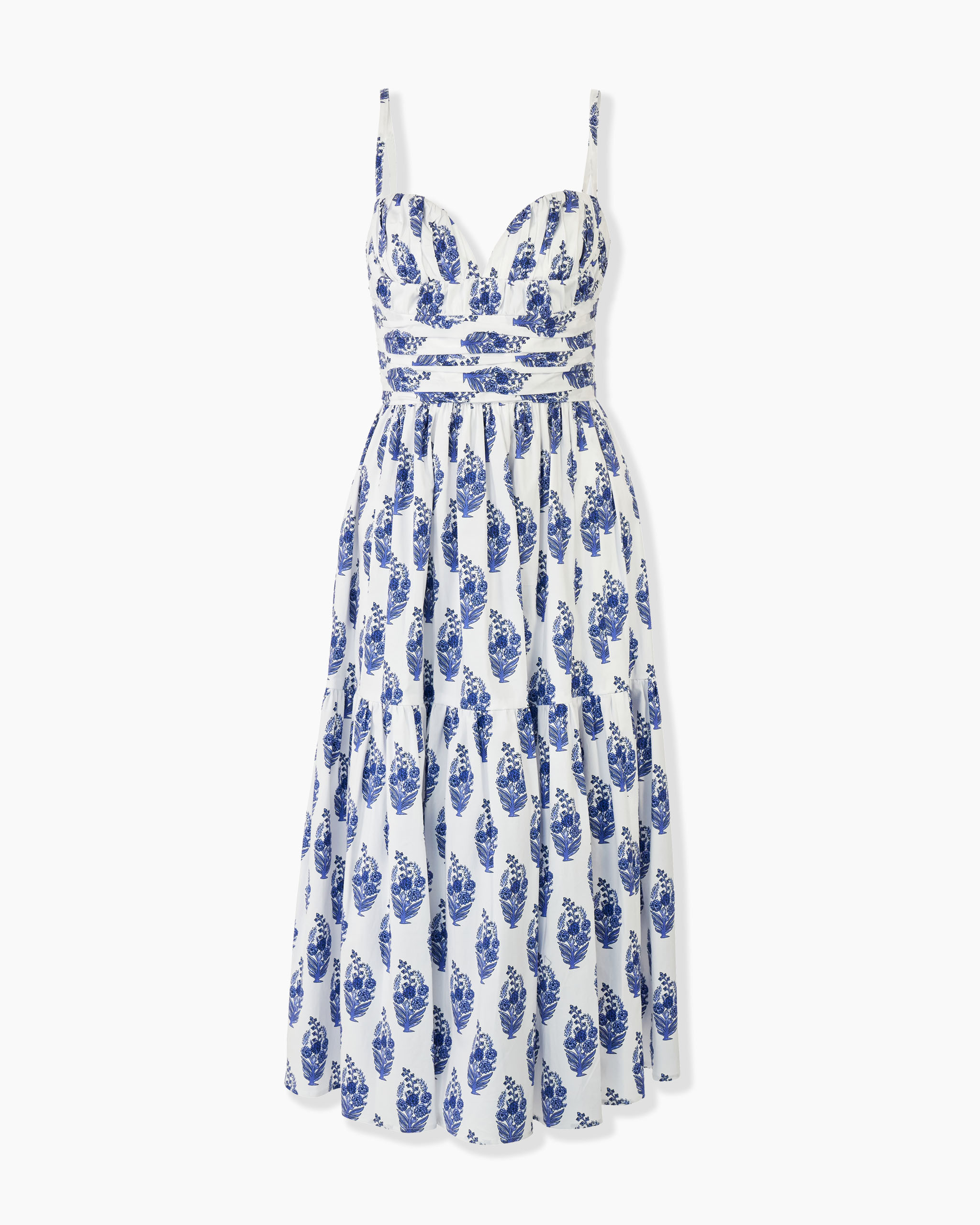 Crafted of stretch-cotton, this flared midi dress showcases a beautiful floral block print. SKU E2511N525FMP SIZE & FIT Close-fitting up to the thigh Midweight stretchy cotton COMPOSITION & CARE 97% Cotton 3% Elastane Washing Instructions Dry Clean Only Made in Italy