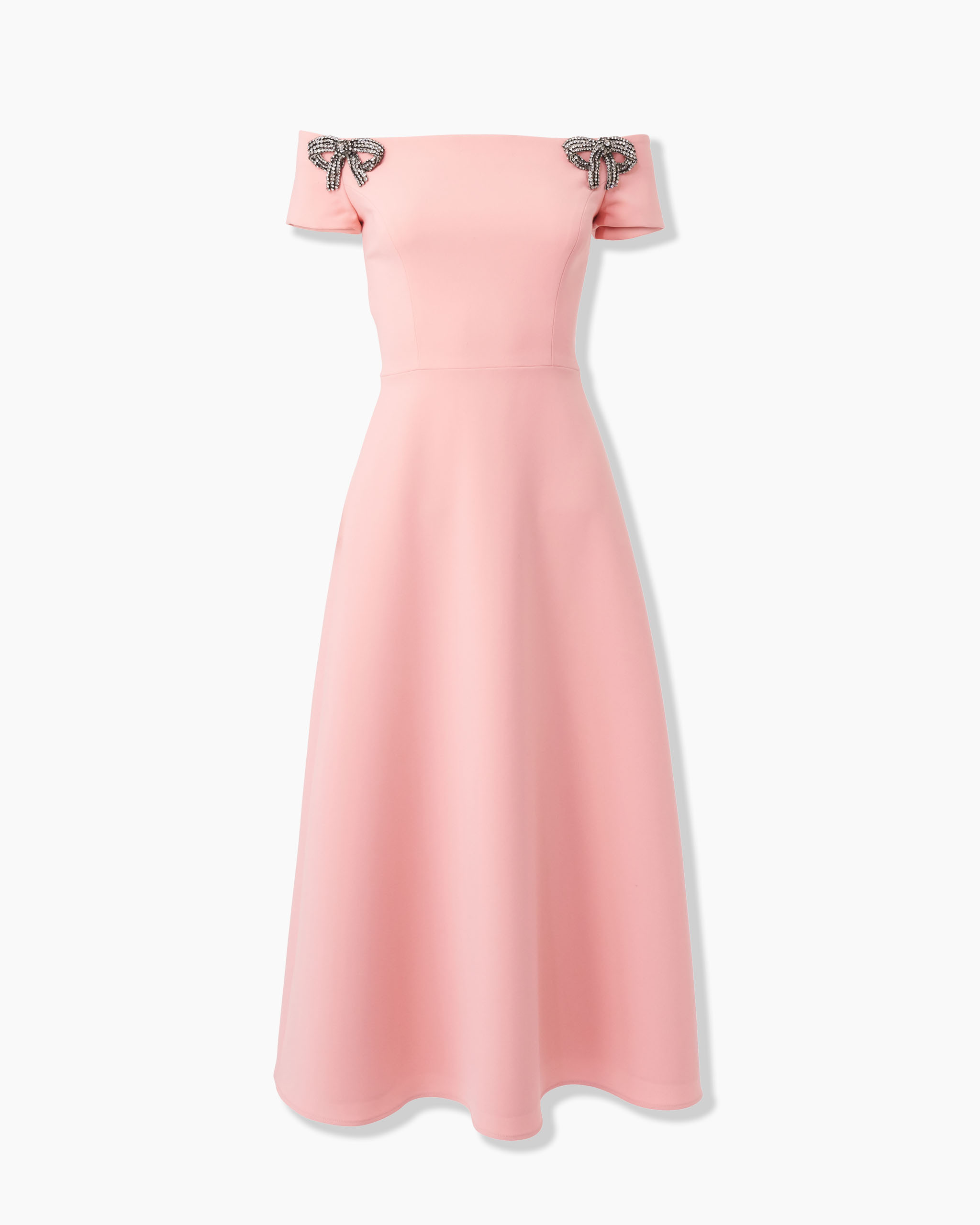 Crystal bow appliques bring vintage glamour to this off-shoulder dress, cut from fluid crepe with a fitted bodice and a flared A-line skirt. SKU P2511E537SFR SIZE & FIT Fitted bodice with A-line midi skirt Midweight stretch-crepe Model is 178cm/ 5’10” and is wearing a US 2 Bust: 31" Waist: 23" Hips: 34" COMPOSITION & CARE 92% Polyester 8%Polyutherane Washing Instructions Dry Clean Only Made in United States of America