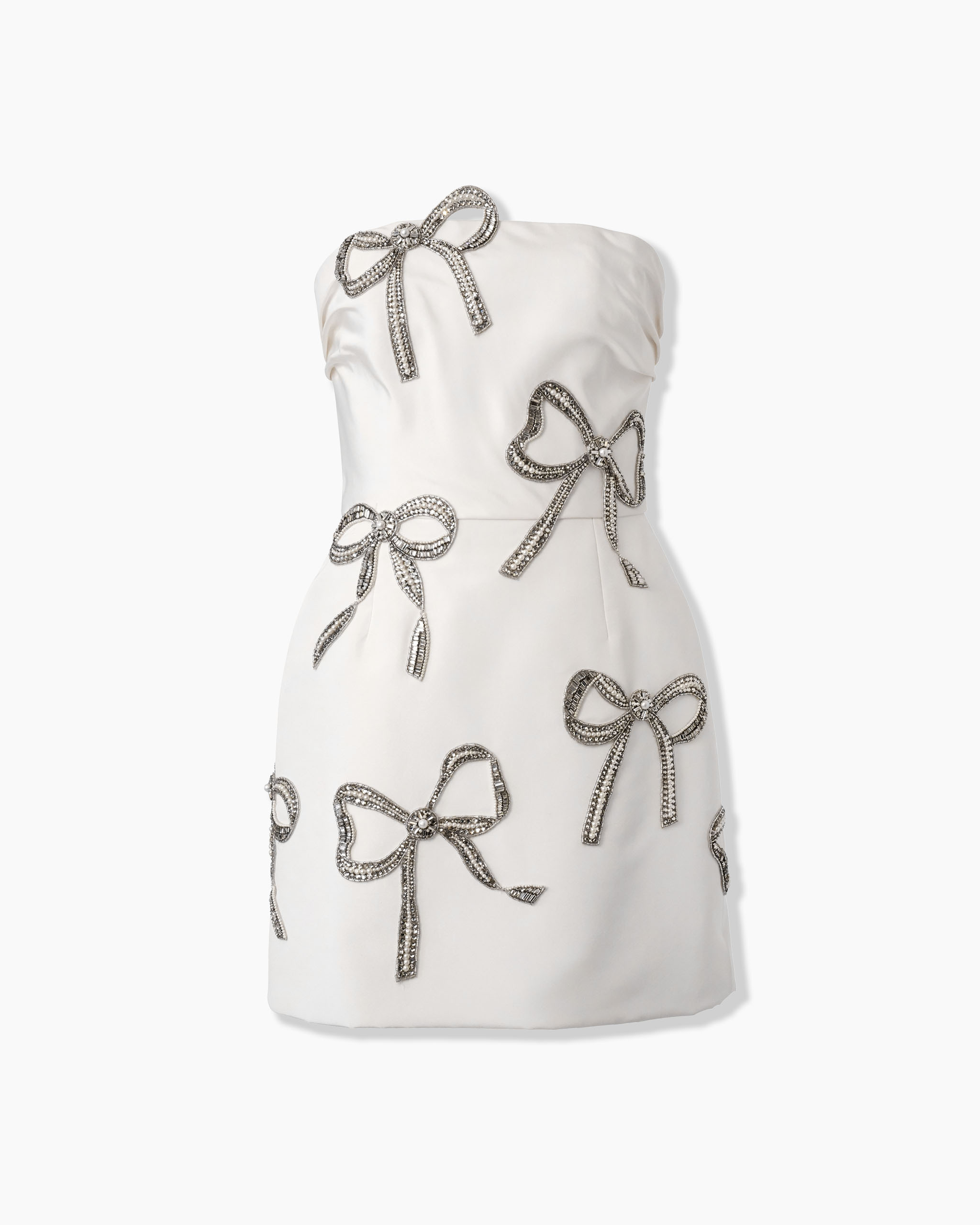 Hand-embroidered bows with smoke crystals and pearls adorn this sparkling mini dress, cut from lustrous silk faille. Pair with the matching Embroidered Bow Tiara and Veil for a bold bridal look. SKU P2511E531SFA SIZE & FIT Close fit through bodice with mini skirt Midweight silk-faille Model is 180 cm/ 5’11” and is wearing a US 2 Bust: 32" Waist: 23" Hips: 35" COMPOSITION & CARE 100% Silk Washing Instructions Dry Clean Only Made in United States of America