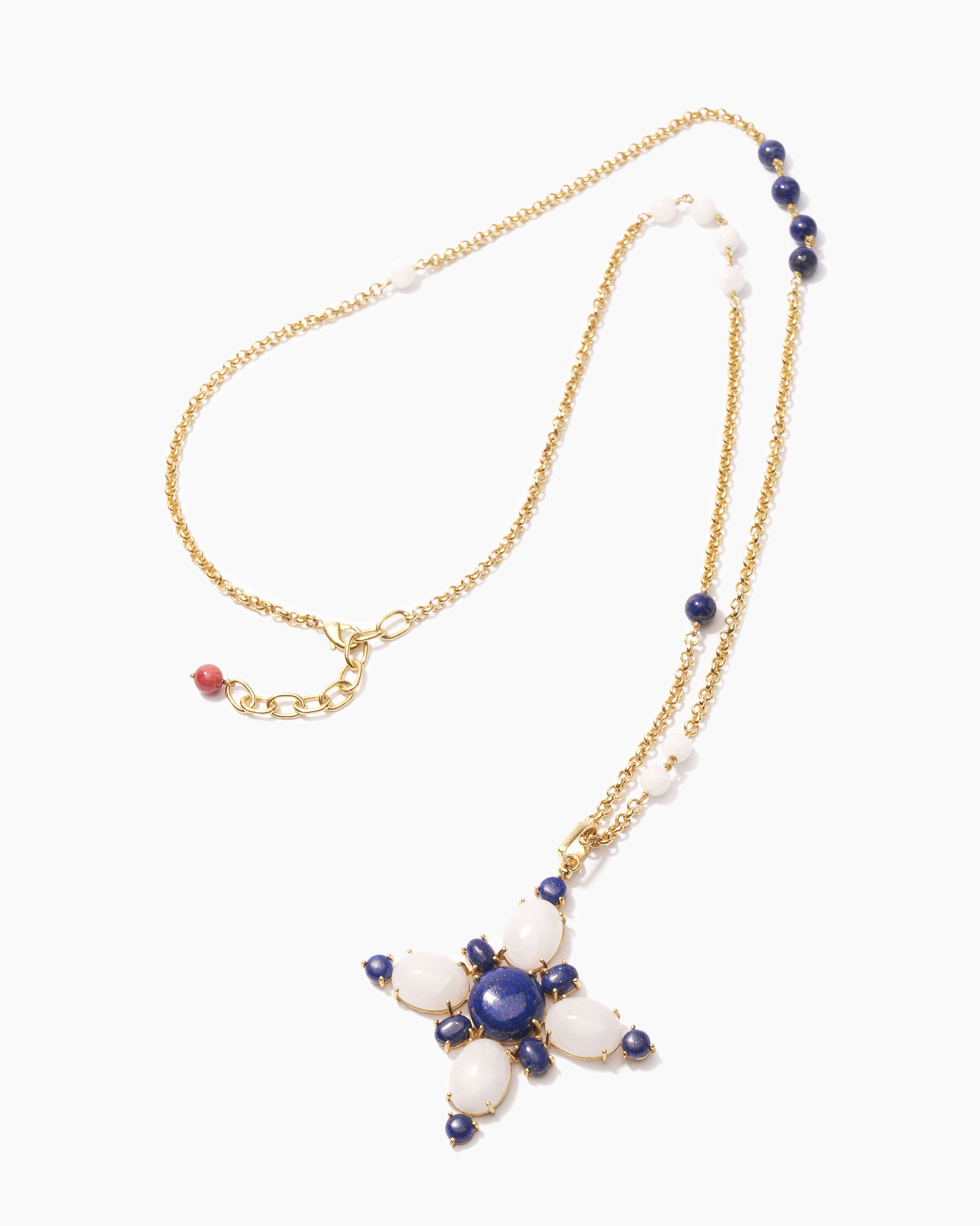 For Resort 2025 we collaborated with Olympia Babylonia to create a capsule of handmade jewelry in striking shapes and dazzling tones. This cross necklace features contrasting stones set on 24k golden brass. SKU OLY36N400GEM COMPOSITION & CARE Lapis-lazuli and white quartz cross on 24k golden brass with combined chain with lapislasuli and white quartz pearls Washing Instructions Clean with a soft, dry cloth