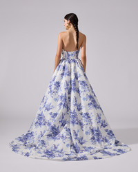 Decorated with romantic florals inspired by vintage porcelain, this taffeta ball gown features a gathered bodice and a full, pleated skirt. Chine printing gives the pattern a soft, blurred finish. Strapless Boning at bodice Side pockets Concealed zip fastening at the back SKU E2511N702CBT SIZE & FIT Fitted bodice, full maxi skirt Lightweight non-stretchy taffeta Model is 178cm/ 5’10” and is wearing a US 2 Bust: 30" Waist: 23" Hips: 35" COMPOSITION & CARE 100% Polyester Washing Instructions Dry Clean Only Made in United States of America