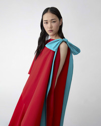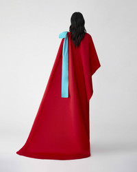 Crafted from Herrera-red silk faille, this form-fitting column gown is sheathed in a dramatic cape that extends into a sweeping train. A turquoise bow at the shoulder adds striking contrast, accentuating the gown’s classical elegance. Cape attached to column gown SKU R2611N720SFA SIZE & FIT Close-fitting column silhouette, maxi length with voluminous cape Midweight silk-faille Model is 179cm/ 5’9” and is wearing a US 2 Bust: 30" Waist: 24" Hips: 34" COMPOSITION & CARE 100% Silk Washing Instructions Dry Clean Only Made in United States of America