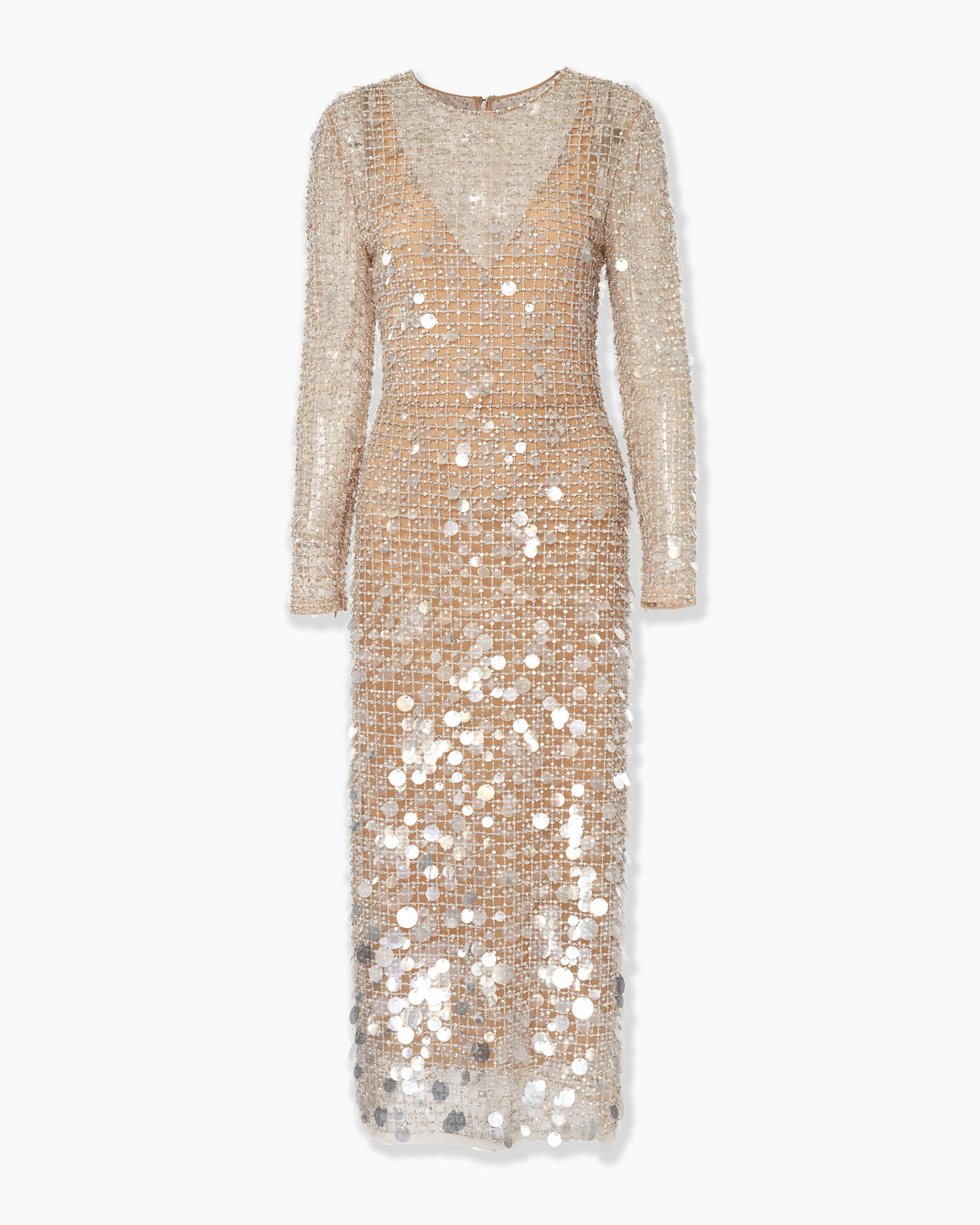 This ethereal dress is crafted from sheer tulle which is hand-embroidered with clear beads, crystals, and paillettes that gradually increase in volume from the collar to the hem – a look inspired by fresh-fallen rain. Runway style Lined Concealed zip closure at the back Accessorize it with a skinny belt, as per the runway. SKU F2511E556NTU SIZE & FIT Close-fitting column silhouette, midi length Lightweight embellished tulle Model is 178cm/ 5’10” and is wearing a US 2 Bust: 31" Waist: 23" Hips: 33" COMPOSITION & CARE 100% Nylon Washing Instructions Dry Clean Only