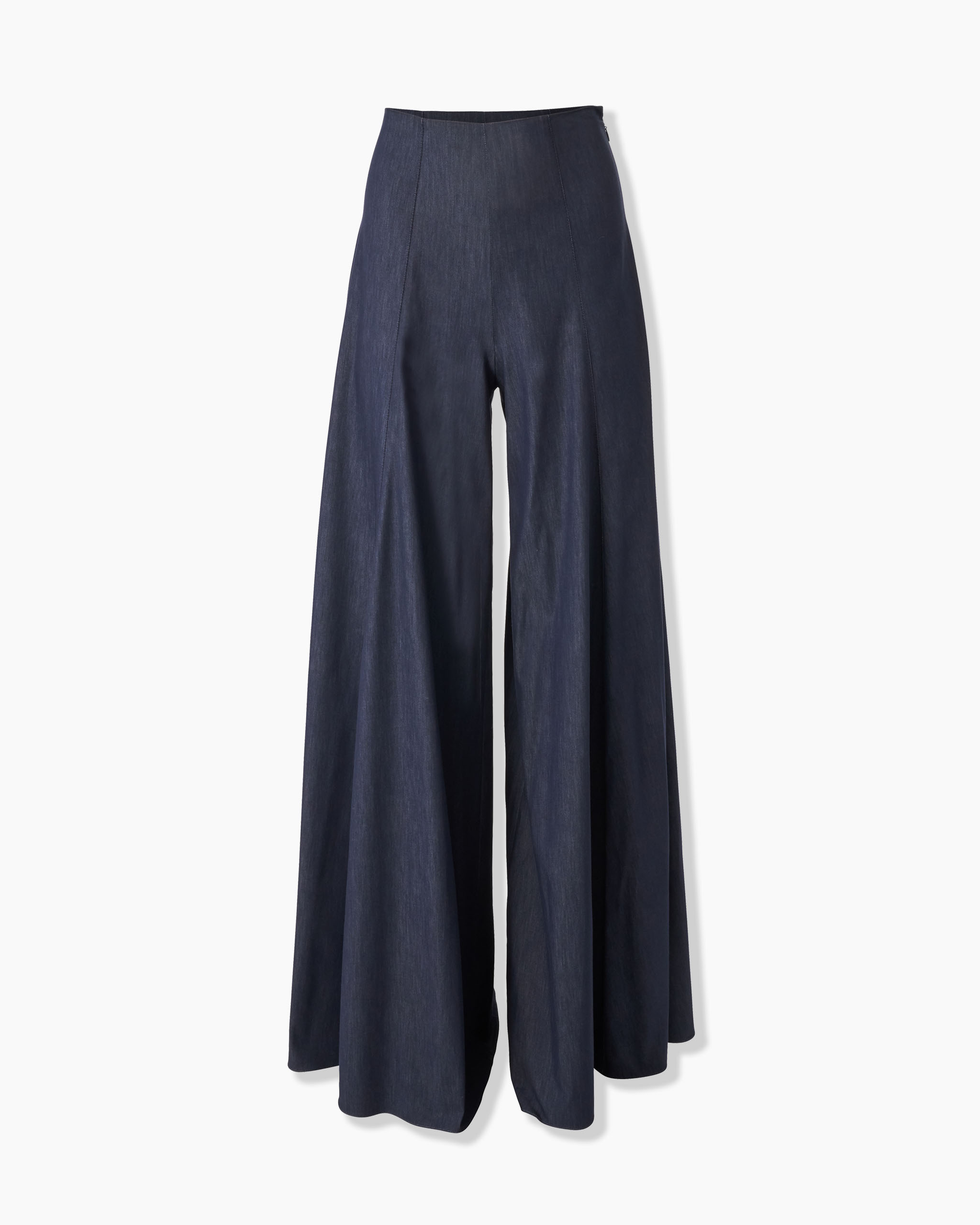 These floor-length palazzo pants are cut from lightweight denim with a hint of stretch and a dramatic ultra wide-leg silhouette. SKU P2511N404DEN SIZE & FIT Extra wide-leg fit, extra-long length Midweight stretch-denim Model is 178cm/ 5’10” and is wearing a US 2 Bust: 31" Waist: 23" Hips: 34" COMPOSITION & CARE 58% Cotton 38% Nylon 4% Elastane Washing Instructions Dry Clean Only Made in United States of America