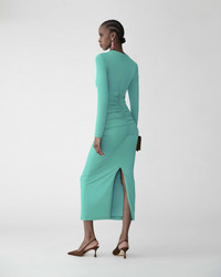 This turquoise jersey midi dress is softly ruched at the shoulder, waist, and hips for a flattering silhouette. Long sleeves and a back slit complete the sleek, form-fitting look. Back slit Concealed zip fastening at the back SKU R2615N502JRS SIZE & FIT Close fit, midi length Midweight jersey Model is 178cm/ 5’10” and is wearing a US 2 Bust: 32" Waist: 23" Hips: 34" COMPOSITION & CARE 94% Viscose 6% Elastane Washing Instructions Dry Clean Only Made in China