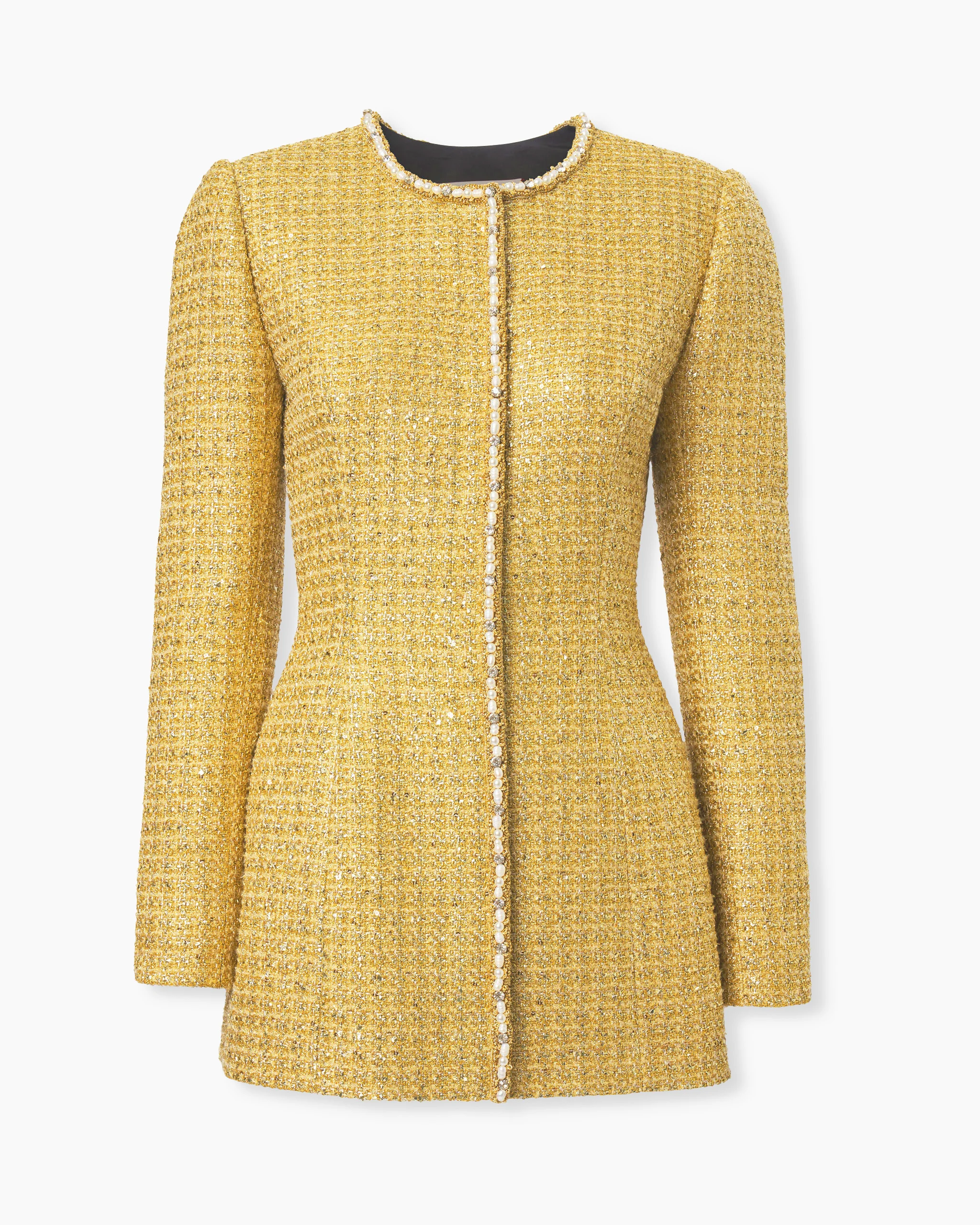 Inspired by the opulence of Ancient Egyptian art, this jacket is tailored from golden lurex tweed that shimmers in the light. Freshwater pearls and rhinestones frame the collar and placket, adding a jewel-box finish. Concealed snap closures at the front Lined SKU C2611E105LUT SIZE & FIT Regular fit Midweight lurex-tweed Model is 178cm/ 5’10” and is wearing a US 2 Bust: 32" Waist: 23.5" Hips: 34.5" COMPOSITION & CARE 35% Nylon 27% Metallised Polyester 20% Polyester 9% Virgin Wool 9% Acrylic Washing Instructions Dry Clean Only