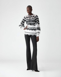 In contrasting bands of black and white Chantilly lace, this mock neck top offers a playful yet refined interpretation of the season’s floral motifs. Scalloped edges at the hem and cuffs complete the look. Balloon sleeves Lined with cami SKU F2511E211SCL SIZE & FIT Slim Fit Lightweight chantilly lace Model is 179cm/ 5’11” and is wearing a US 2 Bust: 29.5" Waist: 22" Hips: 34.5" COMPOSITION & CARE 100% Nylon Washing Instructions Dry Clean Only