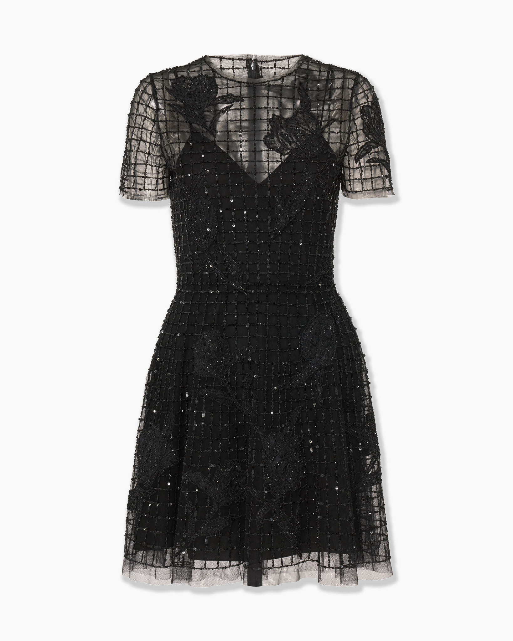 This stunning mini dress is crafted from sheer tulle in a gridded cage design, with hand-embroidered jet beads that grow in size as the skirt flares. Embroidered tulip motifs echo the season’s theme, creating a refined interplay of opacity and transparency. Runway style Lined Concealed zip closure at the back SKU F2511E558NTU SIZE & FIT Close fit, mini length Lightweight embellished tulle Model is 179cm/ 5’11” and is wearing a US 2 Bust: 29.5" Waist: 22" Hips: 34.5" COMPOSITION & CARE 100% Nylon Washing Instructions Dry Clean Only