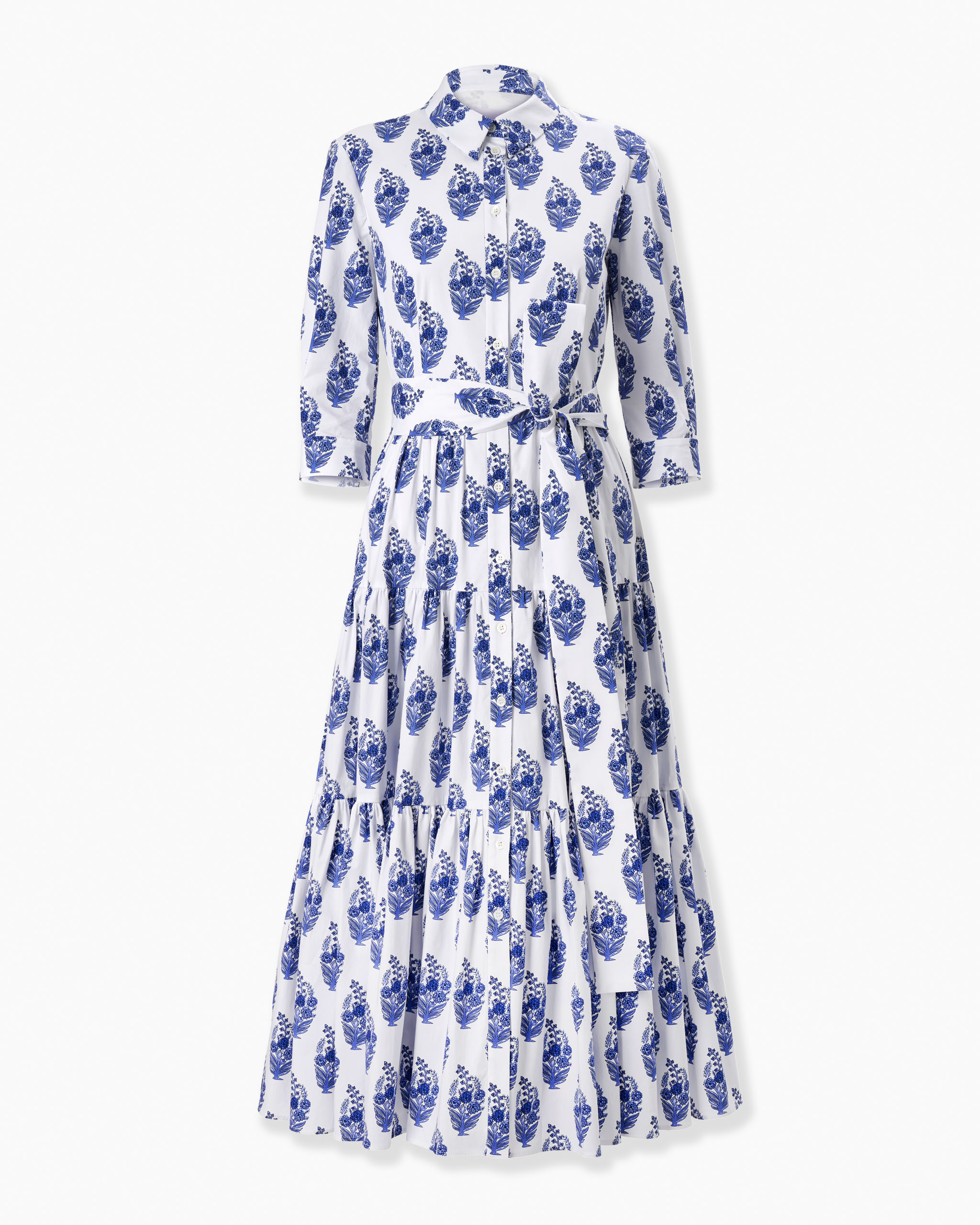 Showcasing a beautiful floral block print, this elegant shirt dress is crafted from stretch-cotton with three-quarter sleeves and a tiered midi hem. Point collar Buttoned front Belted waist SKU E2511N506FMP SIZE & FIT Regular-fitting top, A-line midi skirt, sash-tie waist Midweight stretchy cotton Model is 178cm/ 5’10” and is wearing a US 2 Bust: 30" Waist: 23" Hips: 35" COMPOSITION & CARE 97% Cotton, 3% Elastane Washing Instructions Dry Clean Only Made in Italy