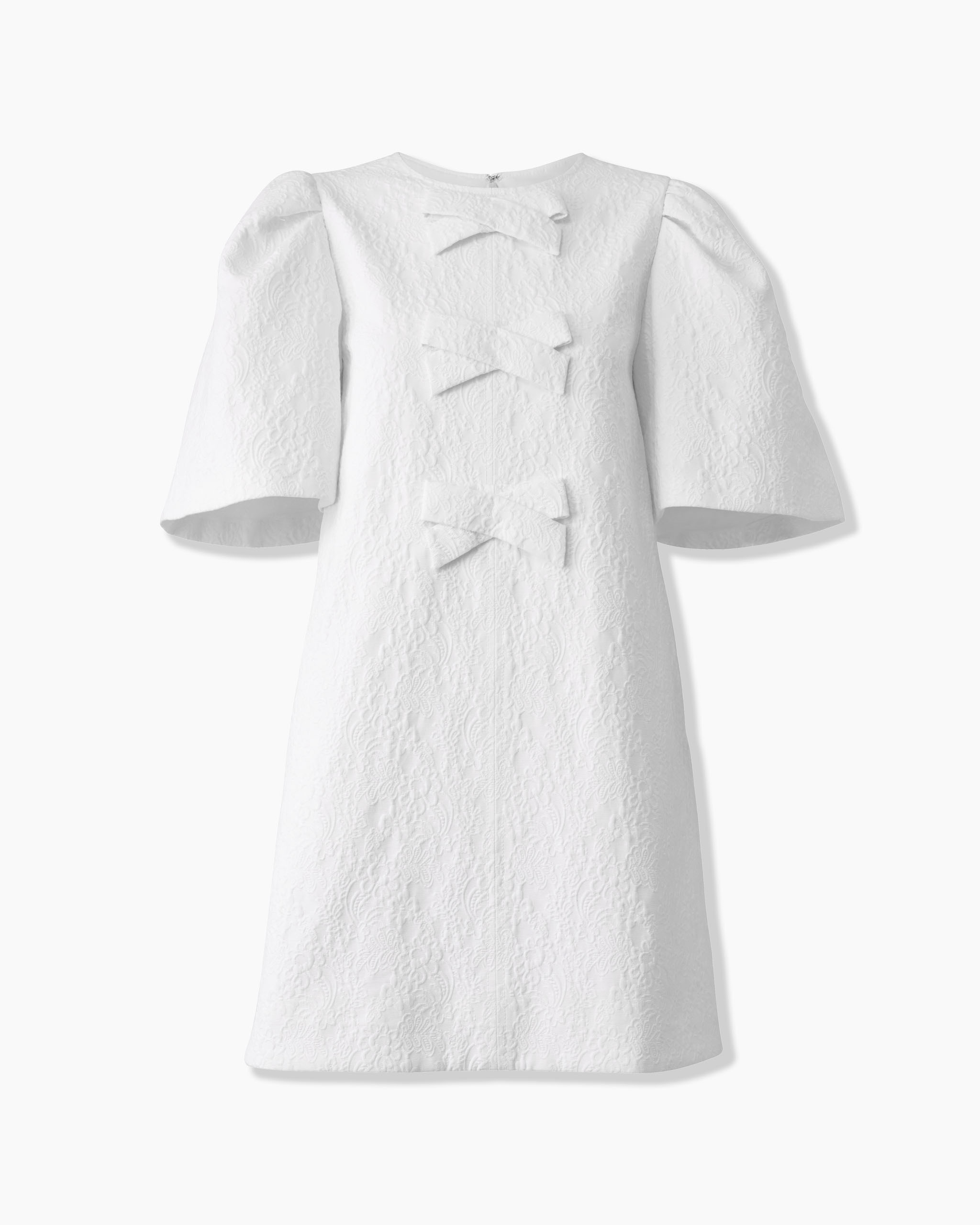 Crafted from textured floral cloque, this playful mini dress features a voluminous silhouette and large pleated bows inspired by the 1950's doll's collection of Wes Gordon's mother. Concealed zip fastening at the back SKU P2511N518CCQ SIZE & FIT Regular fit, mini-length Midweight cotton blend Model is 178cm/ 5’10” and is wearing a US 2 Bust: 31" Waist: 23" Hips: 34" COMPOSITION & CARE 95% Cotton 5% Viscose Washing Instructions Dry Clean Only Made in United States of America