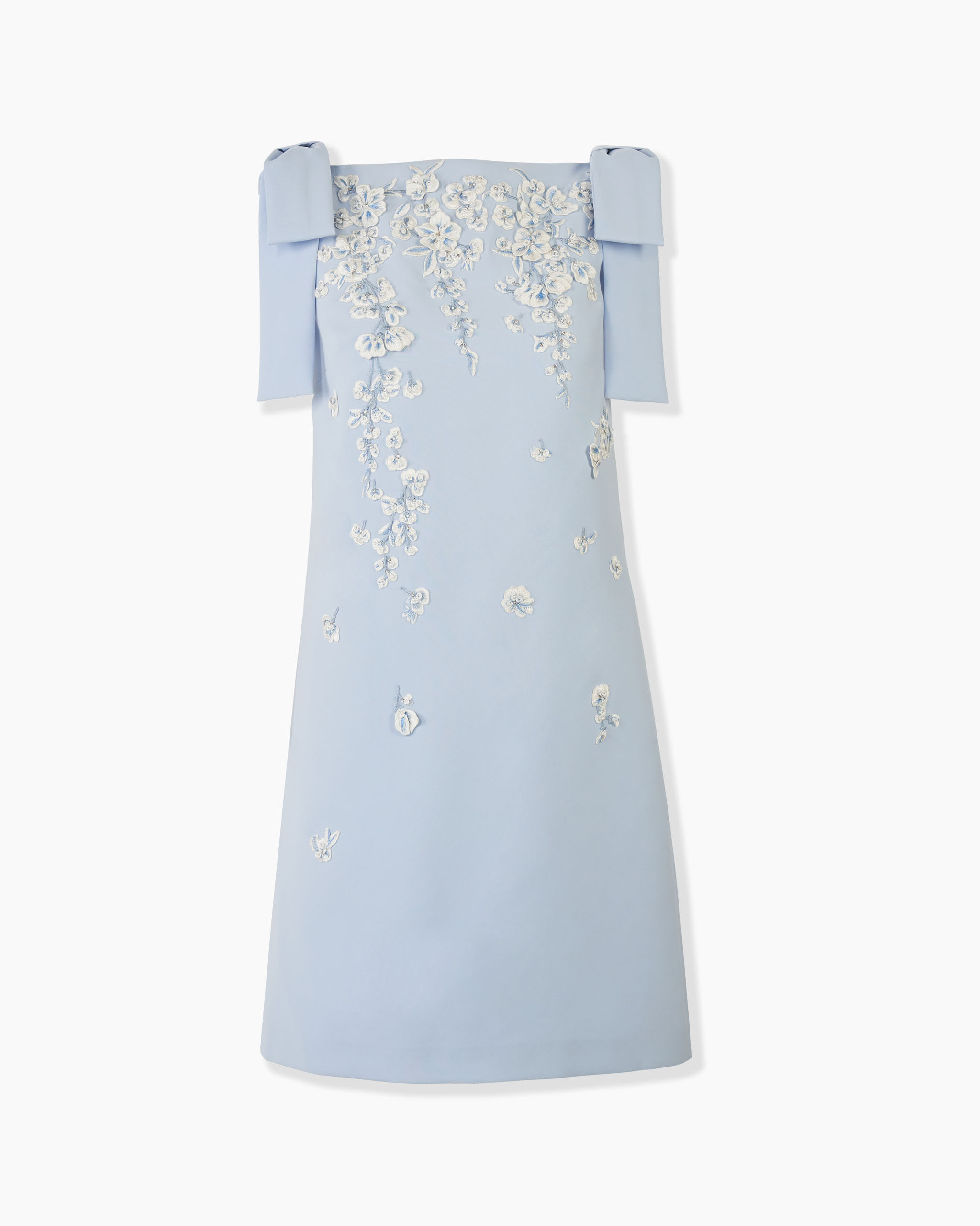The classic shift is given an ultra-feminine twist with flirty bow shoulders and elaborate wisteria embroidery, realized in thread, crystal, and beads. Decorative bows at the shoulders Concealed zip fastening at the back SKU E2511E523SFR SIZE & FIT Straight fit, mini length Midweight stretchy crepe Model is 178cm/ 5’10” and is wearing a US 2 Bust: 30" Waist: 23" Hips: 35" COMPOSITION & CARE 92% Polyester 8% Polyurethane Washing Instructions Dry Clean Only