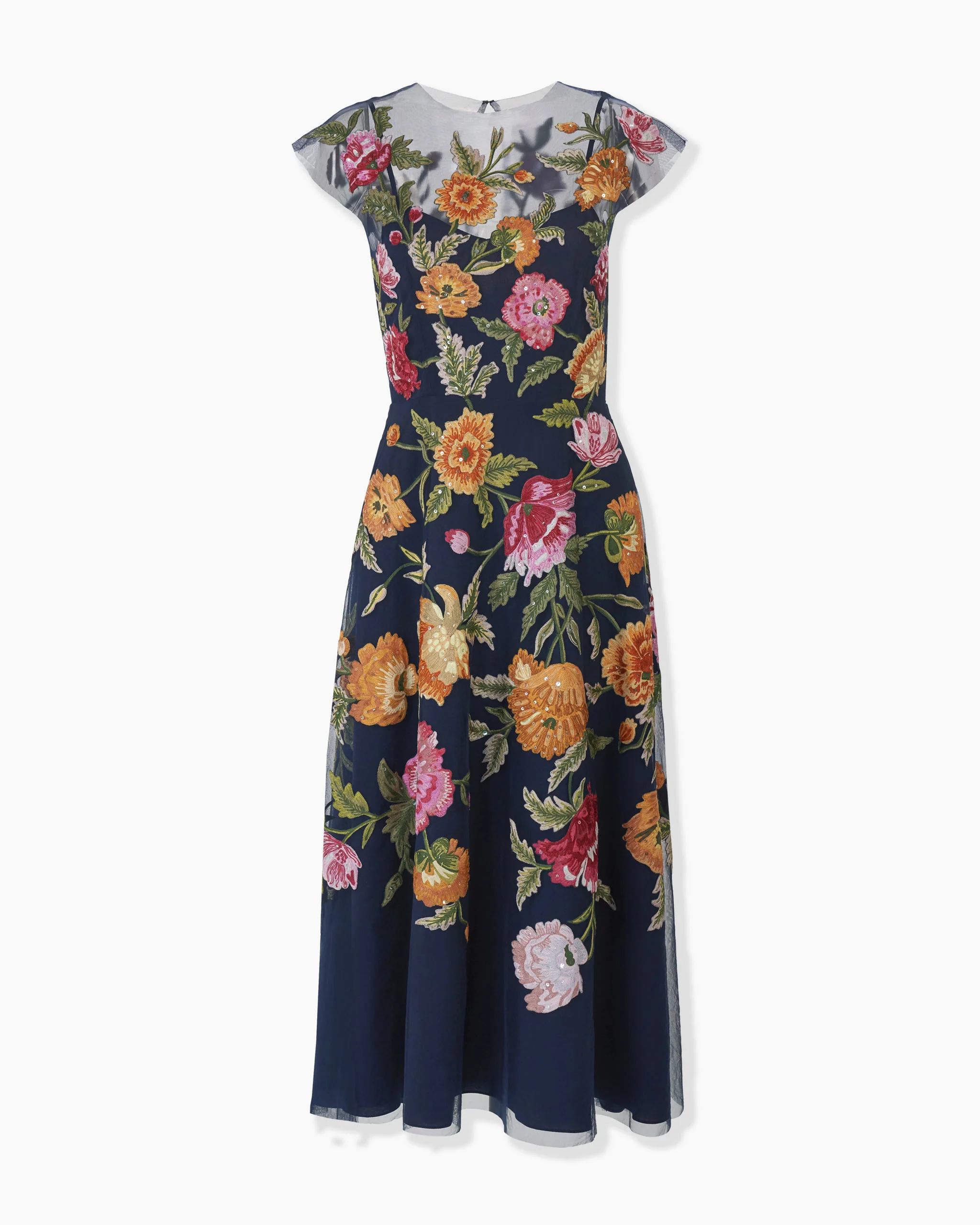 This midnight-blue tulle dress is embroidered with vibrant poppy motifs inspired by the faded beauty of ancient frescoes. Framed by a transparent neckline, it’s finished with scattered sequins for a light-catching effect. Cami lining Keyhole back Concealed zip closure at the back SKU R2611E543NTU SIZE & FIT Fitted bodice with A-line midi skirt Lightweight embellished tulle Model is 177cm/ 5’9” and is wearing a US 2 Bust: 31" Waist: 24" Hips: 35.5" COMPOSITION & CARE 100% Nylon Washing Instructions Dry Clean Only Made in India