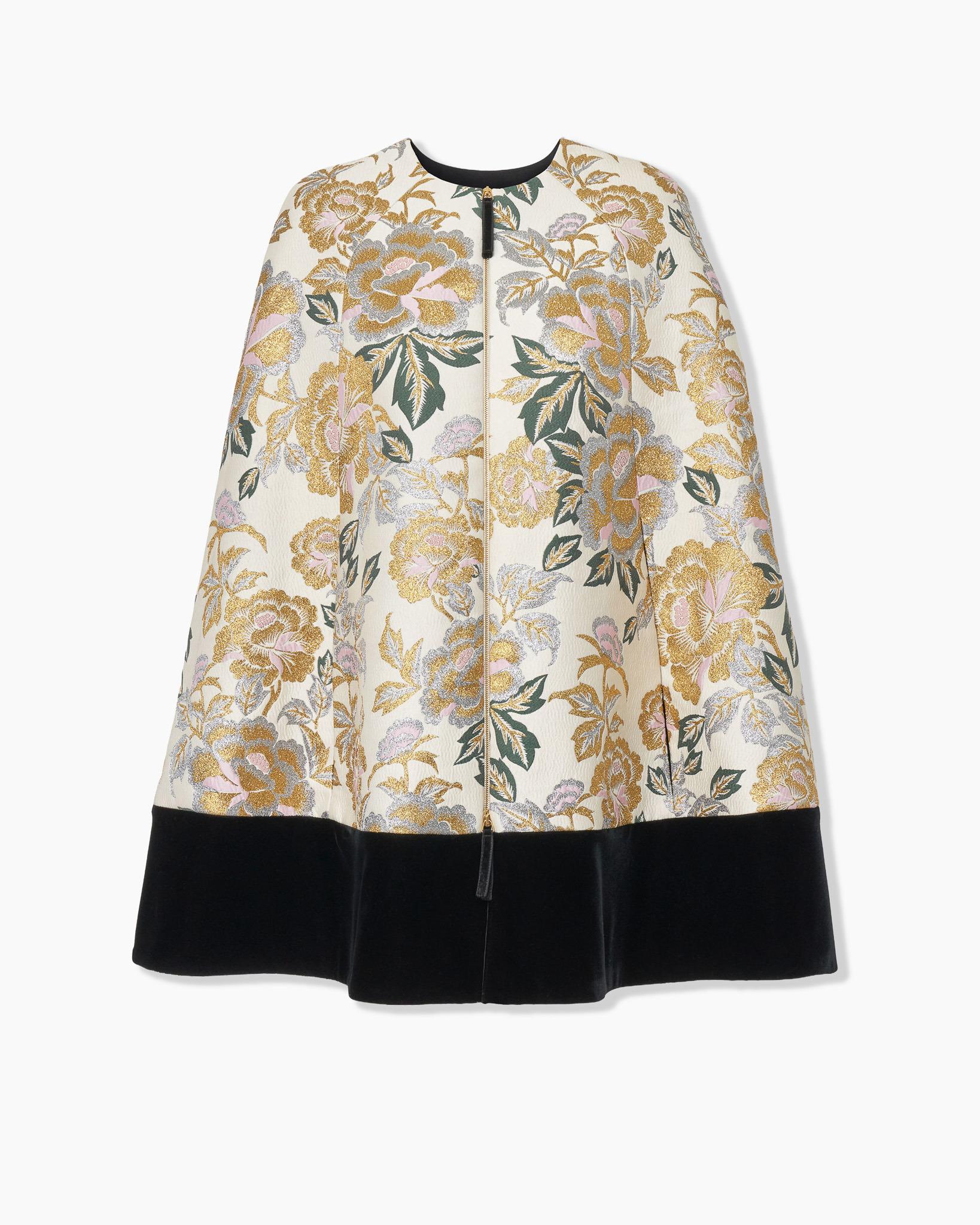 This thigh-length cape is cut from luxurious jacquard, intricately woven with silver, green, and golden threads in a vintage-inspired floral pattern. A velvet-trimmed hem adds to its opulence. Runway style Zip closure at the front SKU F2511N606FLJ SIZE & FIT Loose fit Midweight jacquard Model is 179cm/ 5’11” and is wearing a US 2 Bust: 29.5" Waist: 22" Hips: 34.5" COMPOSITION & CARE 79% Polyester, 11% Polyester Metal, 10% Nylon Washing Instructions Dry Clean Only Made in United States of America