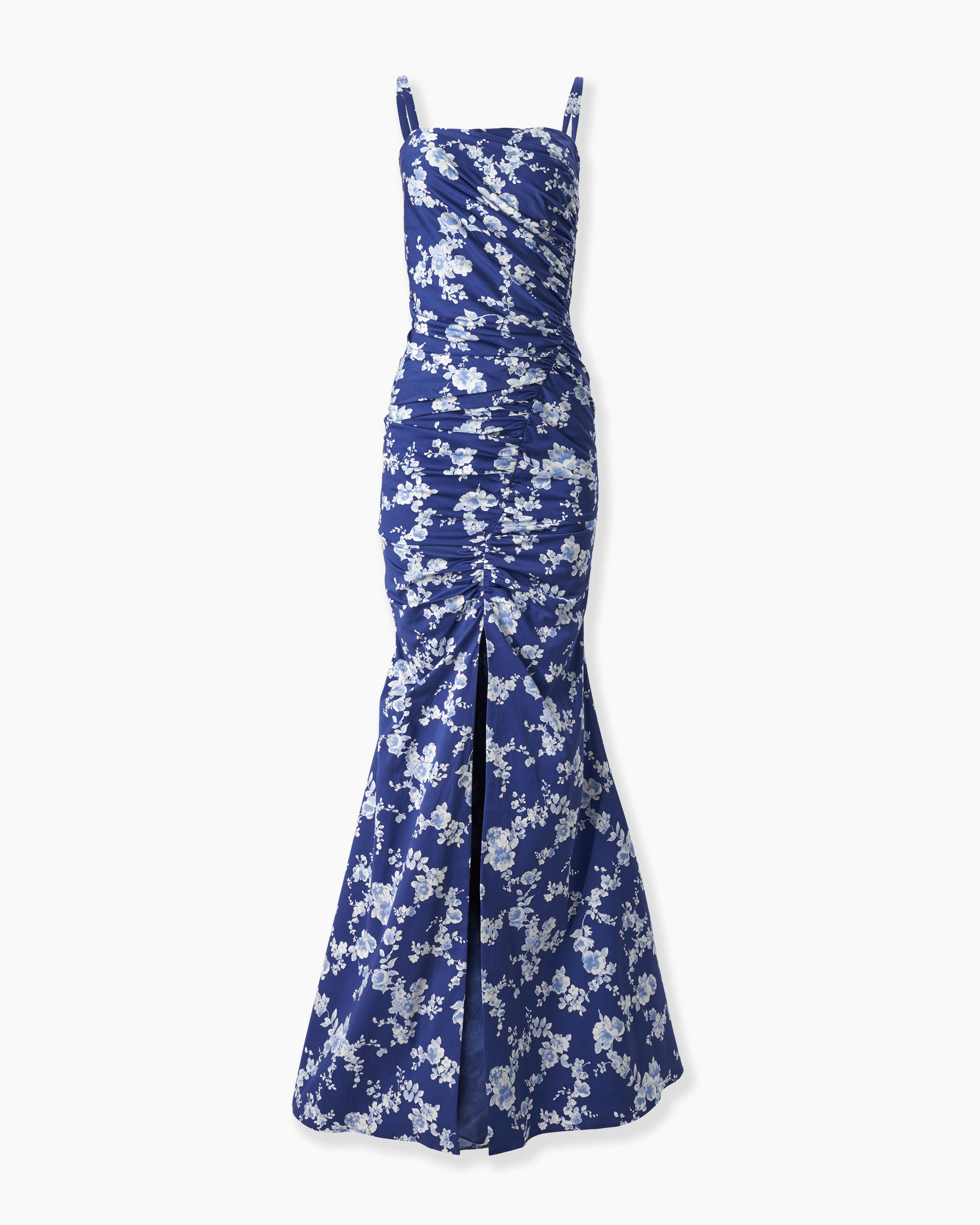 A stunning blue-and-white floral print defines this sleeveless gown, crafted from stretch-cotton faille with asymmetric ruching and a fluted hem. Slim straps Front slit Concealed zip fastening at back SKU E2511N704WPF SIZE & FIT Close-fitting up to the thigh Midweight stretchy cotton blend Model is 178cm/ 5’10” and is wearing a US 2 Bust: 30" Waist: 23" Hips: 35" COMPOSITION & CARE 49% Cotton, 47% Viscose, 4% Elastane Washing Instructions Dry Clean Only Made in Italy