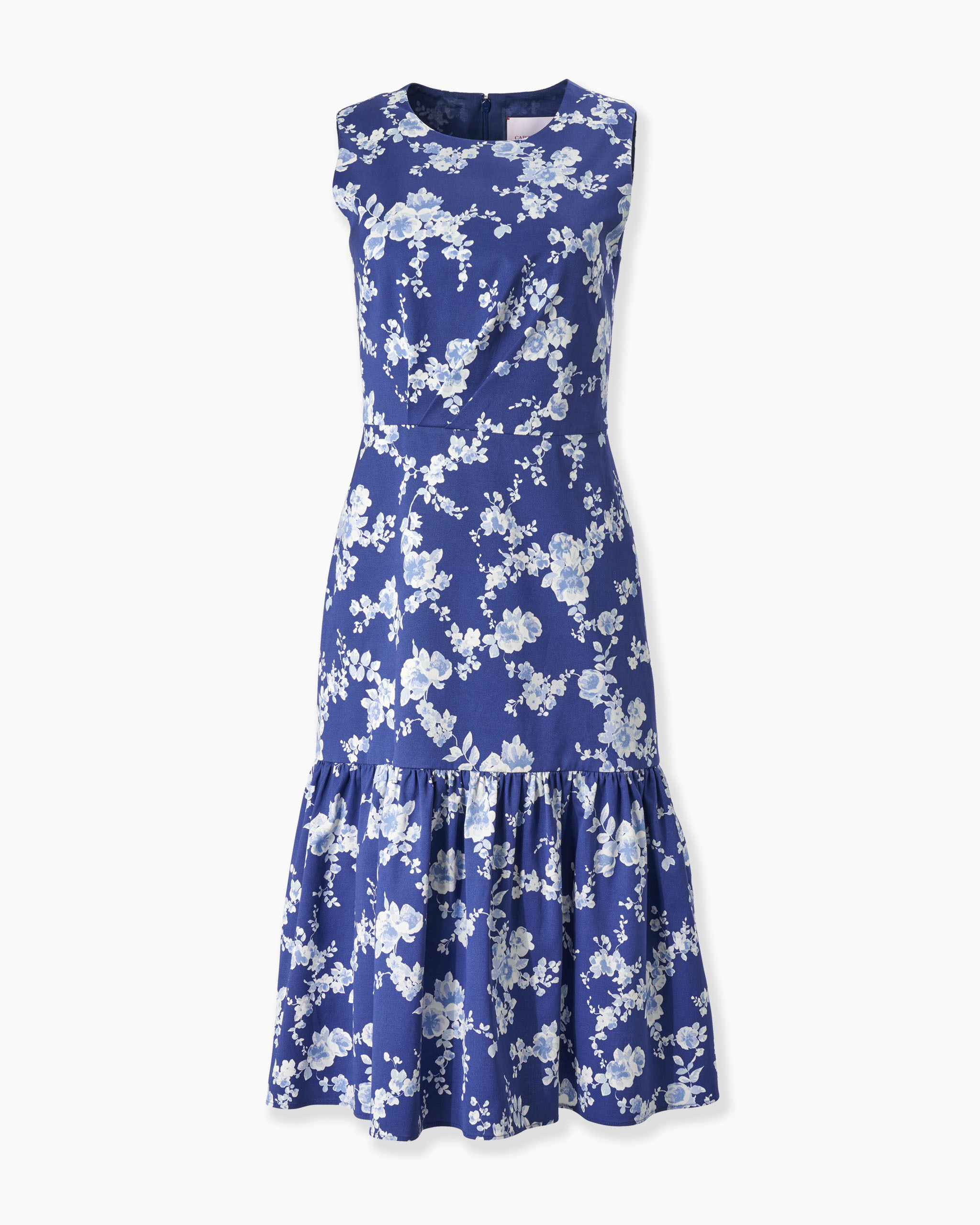 A vintage blue-and-white floral print defines this sleeveless dress, which is cut from stretch-cotton faille with a tiered hem. Concealed zip fastening at back SKU E2511N516WPF SIZE & FIT Fitted bodice, soft A-line midi skirt Midweight stretchy cotton blend Model is 178cm/ 5’10” and is wearing a US 2 Bust: 31" Waist: 23" Hips: 34" COMPOSITION & CARE 49% Cotton, 47% Viscose, 4% Elastane Washing Instruction Dry Clean Only Made in Italy