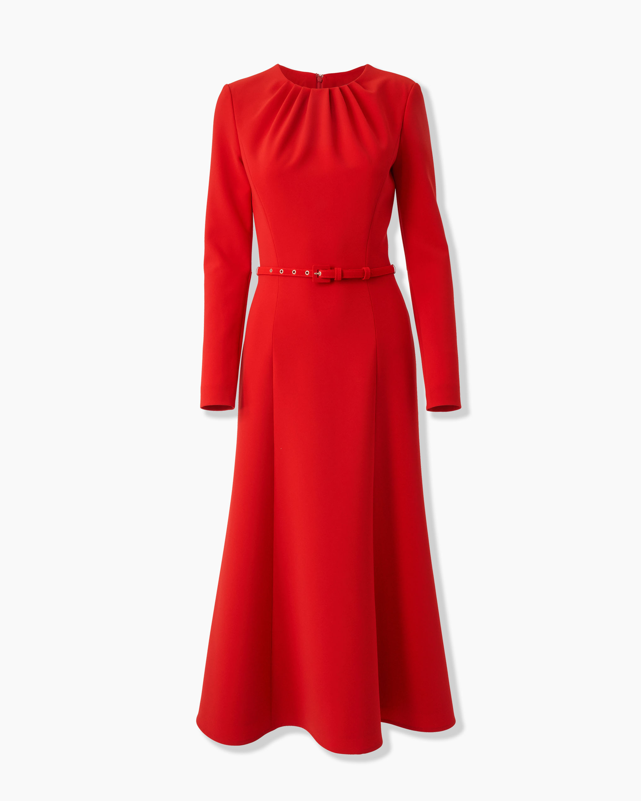 Cut from fluid stretch-crepe, this midi dress features a gathered bodice and a matching belt for a cinched waist. Includes matching belt Concealed zip fastening at the back SKU P2511N543SFR SIZE & FIT Slim fit bodice, A-line midi skirt Midweight stretch-crepe Model is 180 cm/ 5’11” and is wearing a US 2 Bust: 32" Waist: 23" Hips: 35" COMPOSITION & CARE 92% Polyester 8% Polyurethane Washing Instructions Dry Clean Only Made in Italy