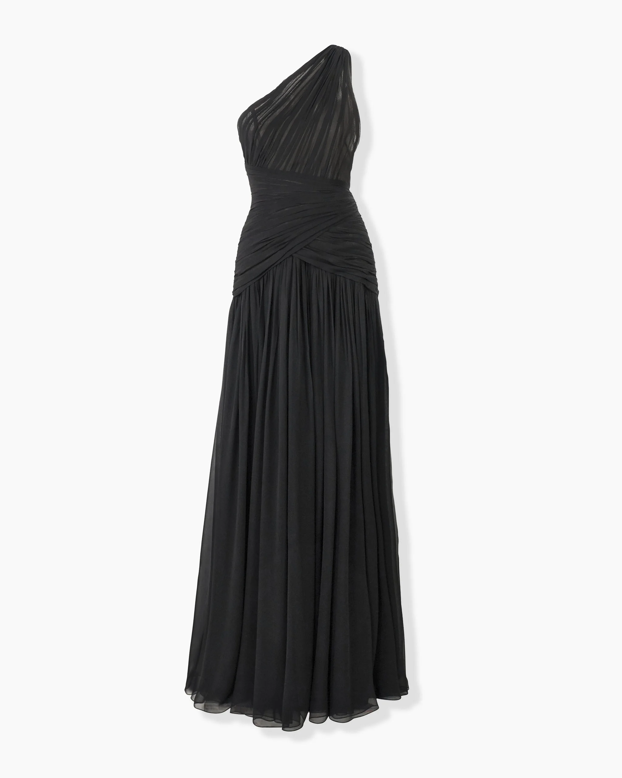 Inspired by a vintage photograph of Mrs. Herrera at a nightclub, this glamorous gown is crafted from layers of lightweight silk chiffon, finely gathered at the shoulder and waist. A deep slit at the front reveals an alluring flash of skin. Front slit SKU R2611N700SCH SIZE & FIT Close-fitting through bodice, voluminous skirt Lightweight silk-chiffon Model is 178cm/ 5’10” and is wearing a US 2 Bust: 32" Waist: 23" Hips: 34" COMPOSITION & CARE 100% Silk Washing Instructions Dry Clean Only Made in United States of America