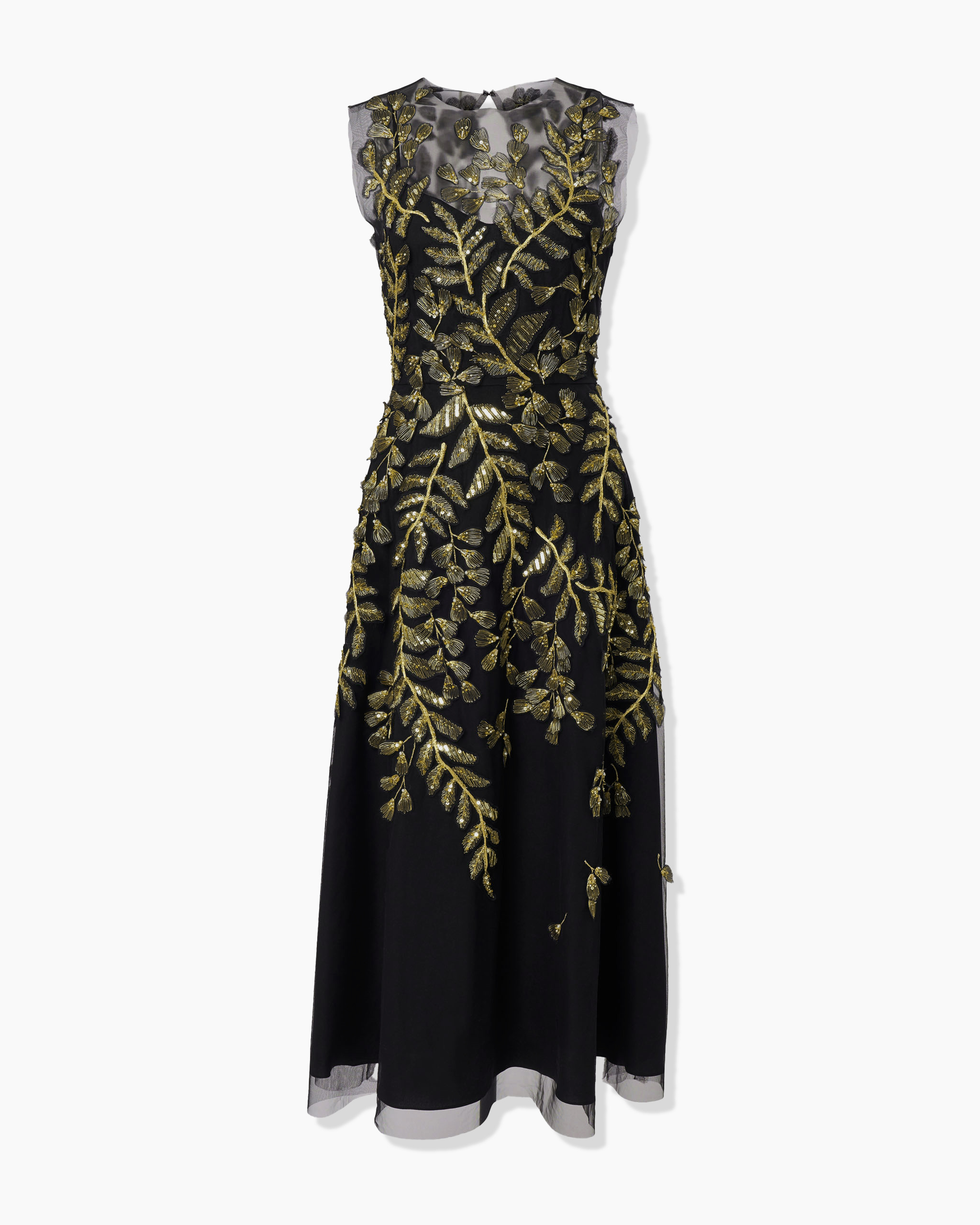 A wearable masterpiece, this sleeveless midi dress achieves a sophisticated play of transparency with sparkling gold embroideries of leafy branches over a sheer tulle base. Concealed hook-and-eye closures at the back Cami lining SKU C2611E516NTU SIZE & FIT Fitted bodice with A-line midi skirt Lightweight embellished tulle Model is 176cm/ 5’9” and is wearing a US 2 Bust: 29.5" Waist: 23" Hips: 33.5" COMPOSITION & CARE 100% Virgin Wool Washing Instructions Dry Clean Only Made in India