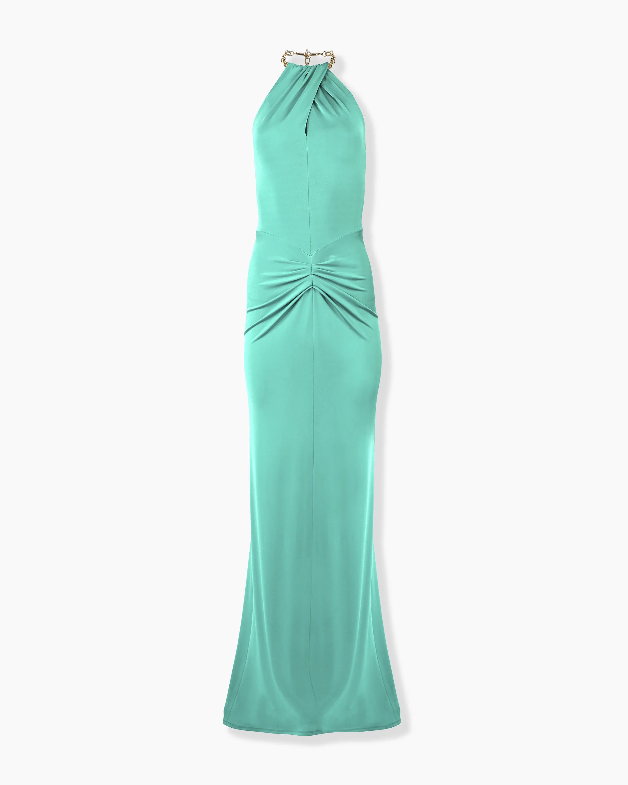 Gathered along a chain-link strap, this turquoise halterneck gown is cut from jersey and designed with a ruched waist to accentuate its close-fitting silhouette. Concealed zip fastening at the back SKU R2615N712JRS SIZE & FIT Close fit, maxi length Midweight jersey Model is 179cm/ 5’9” and is wearing a US 2 Bust: 30" Waist: 24" Hips: 34" COMPOSITION & CARE 94% Viscose 6% Elastane Washing Instructions Dry Clean Only Made in China