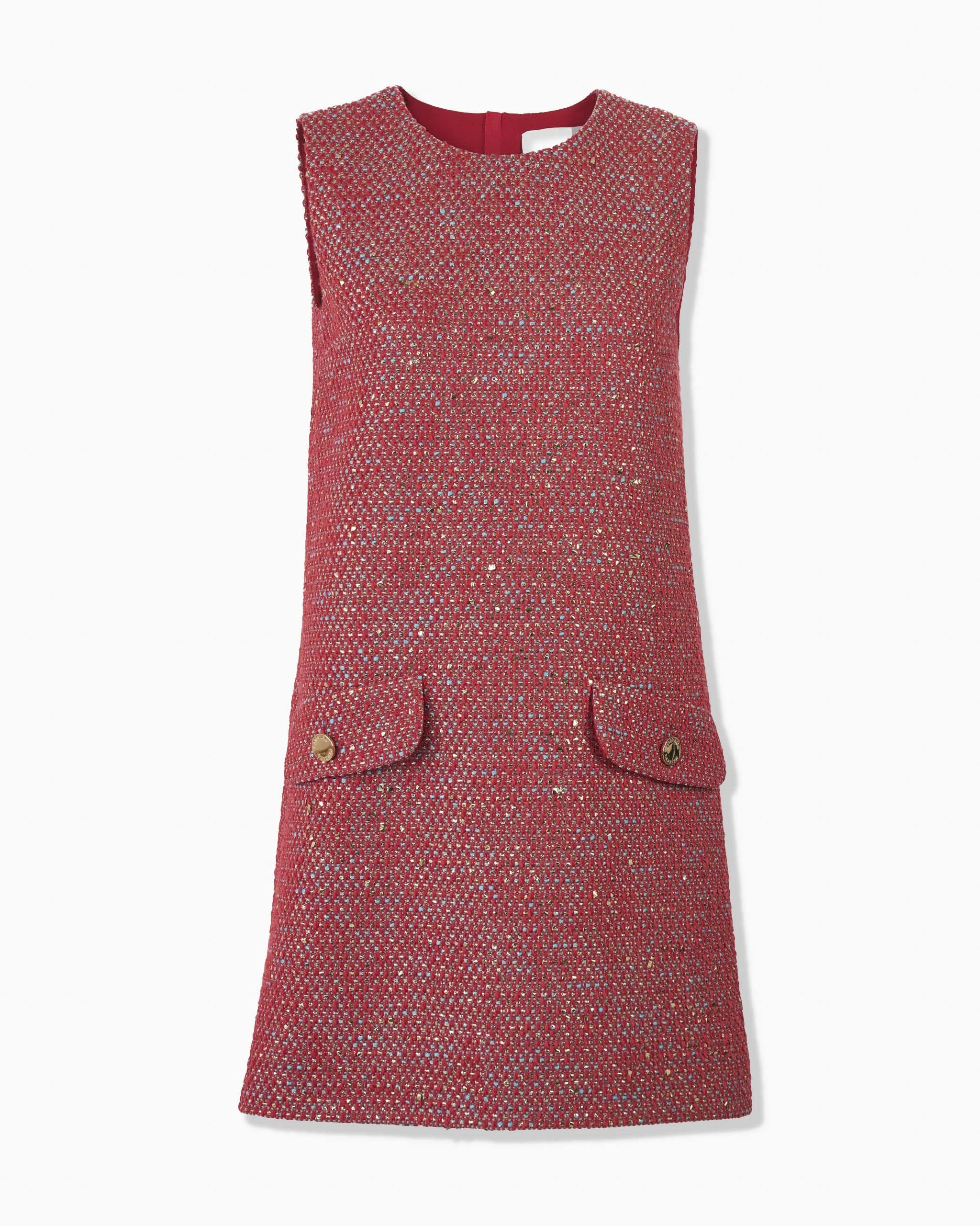 This shift dress is cut from soft, textured tweed woven with shimmering gold lurex. Decorative pocket flaps and gold-tone buttons add a luxurious finish. Decorative buttons and pocket flaps at the waist Fully lined SKU R2611N538LTW SIZE & FIT Loose A-line fit Midweight tweed Model is 175cm/ 5’9” and is wearing a US 2 Bust: 31.5" Waist: 23.5" Hips: 34.5" COMPOSITION & CARE 61% Cotton 31% Wool 4% Viscose 3% Metallic Fibre 1% Nylon Washing Instructions Dry Clean Only Made in Italy