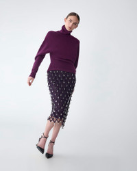 A shimmering raindrop crystal hangs from each tie in this intricate, handcrafted macrame skirt, catching the light and moving gracefully with every step. Style this statement piece with tonal separates for a polished look. Runway style Fully lined SKU F2512E304KJC SIZE & FIT Close-fitting column silhouette, midi length Midweight jewel macrame Model is 178cm/ 5’10” and is wearing a US 2 Bust: 32" Waist: 23.5" Hips: 34.5" COMPOSITION & CARE 100% Viscose Washing Instructions Dry Clean Only