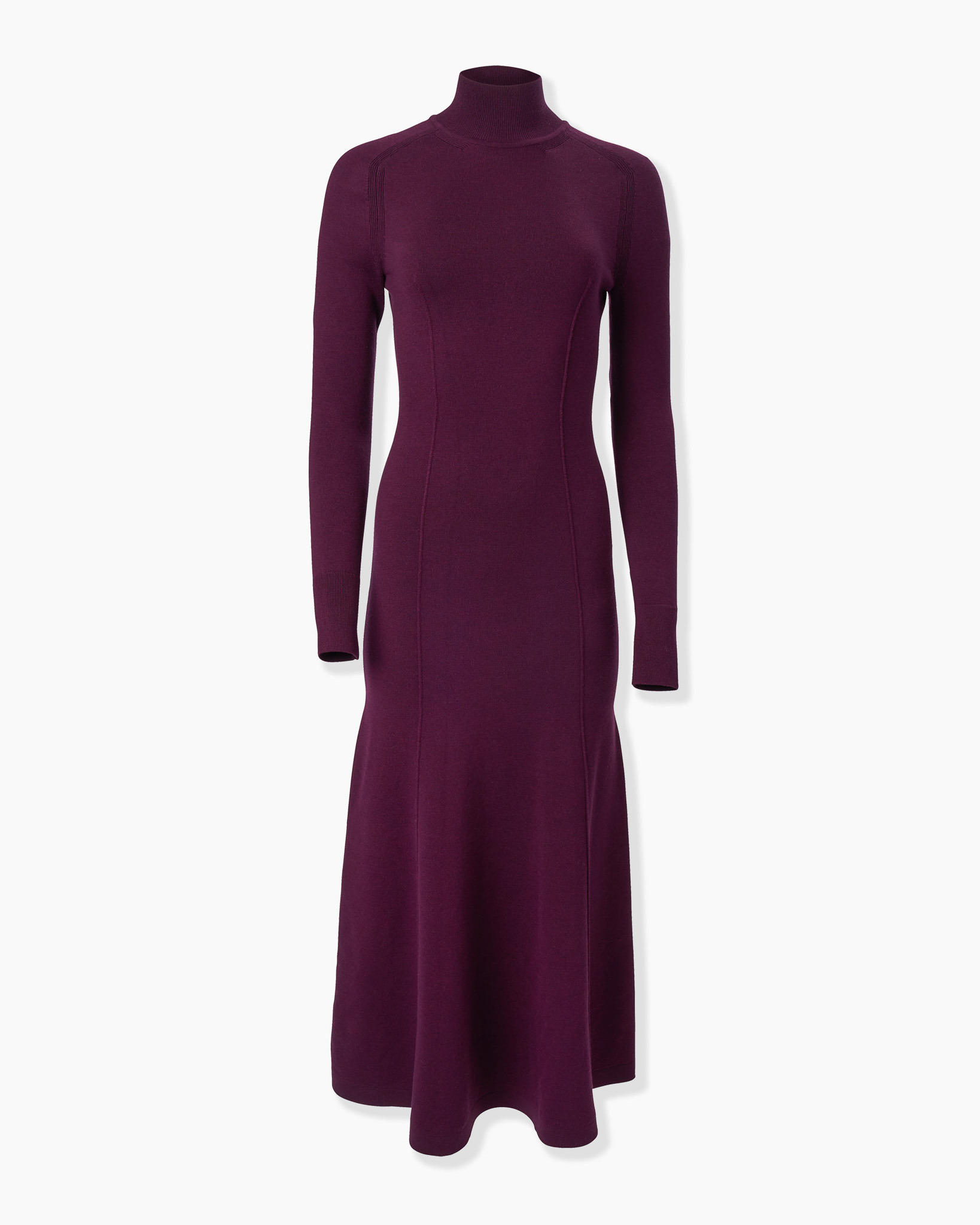 Knit from a fine merino wool and silk blend, this dress features a sleek turtleneck and an elegant flared hem. Soft, lightweight, and versatile, it can be dressed up or down for any occasion. SKU F2512N502KSE SIZE & FIT Close fit bodice with flared hem Midweight wool-silk blend Model is 176cm/ 5’9” and is wearing a US 2 Bust: 29.5" Waist: 23" Hips: 33.5" COMPOSITION & CARE 70% Virgin Wool 30%Silk Washing Instructions Dry Clean Only Made in Italy