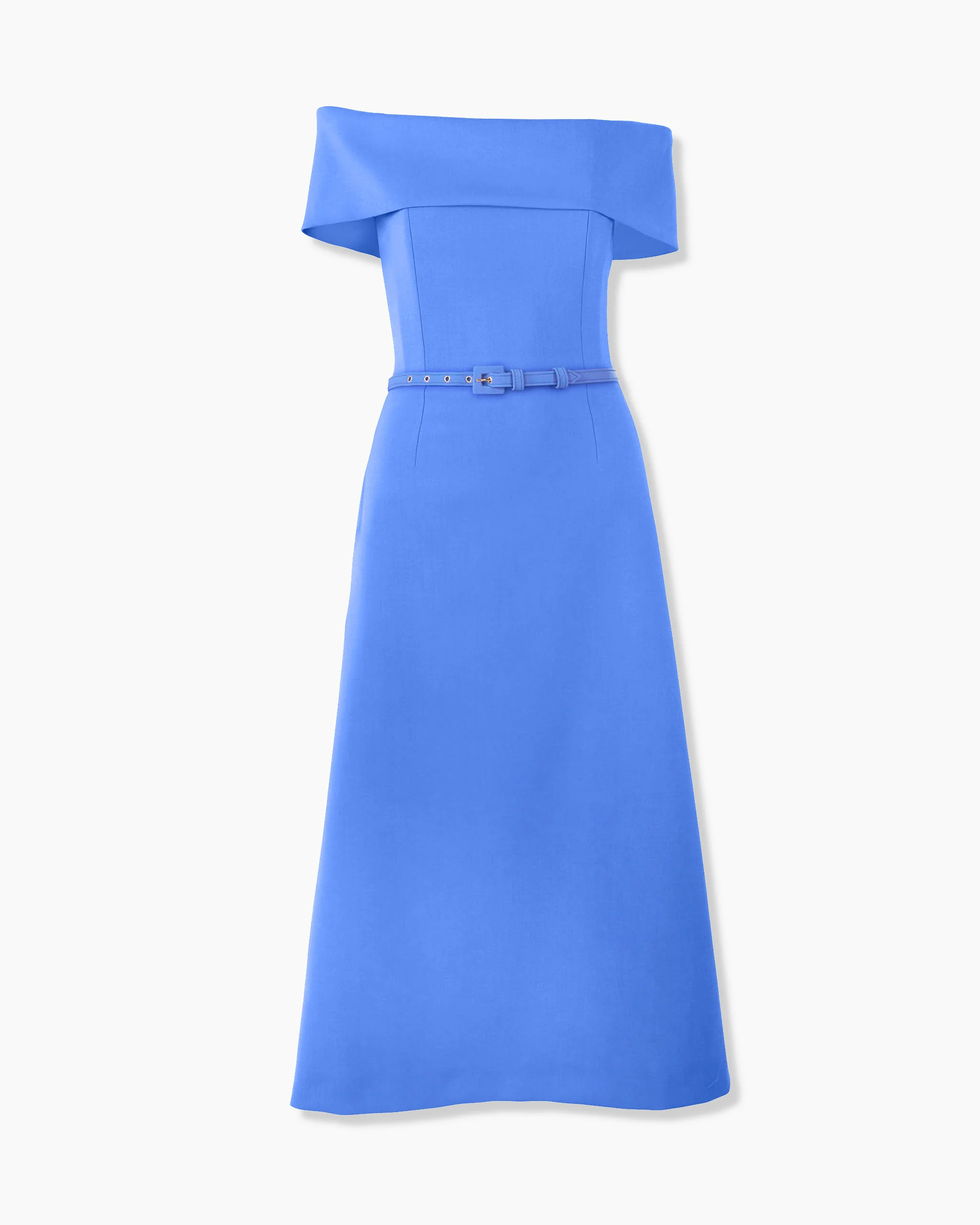 Inspired by sun-washed Aegean hues, this dress is crafted from Italian bi-stretch wool with an off-shoulder neckline and a flattering A-line silhouette. Accessorize it with a golden olive-branch brooch. Silicone tape along the inside top edge Brooch not included SKU R2611N559BWT SIZE & FIT Slim-fit bodice, flared midi skirt Heavyweight stretch-wool Model is 177cm/ 5’9” and is wearing a US 2 Bust: 31" Waist: 24" Hips: 35.5" COMPOSITION & CARE 97% Wool 3% Elastane Washing Instructions Dry Clean Only Made in Italy