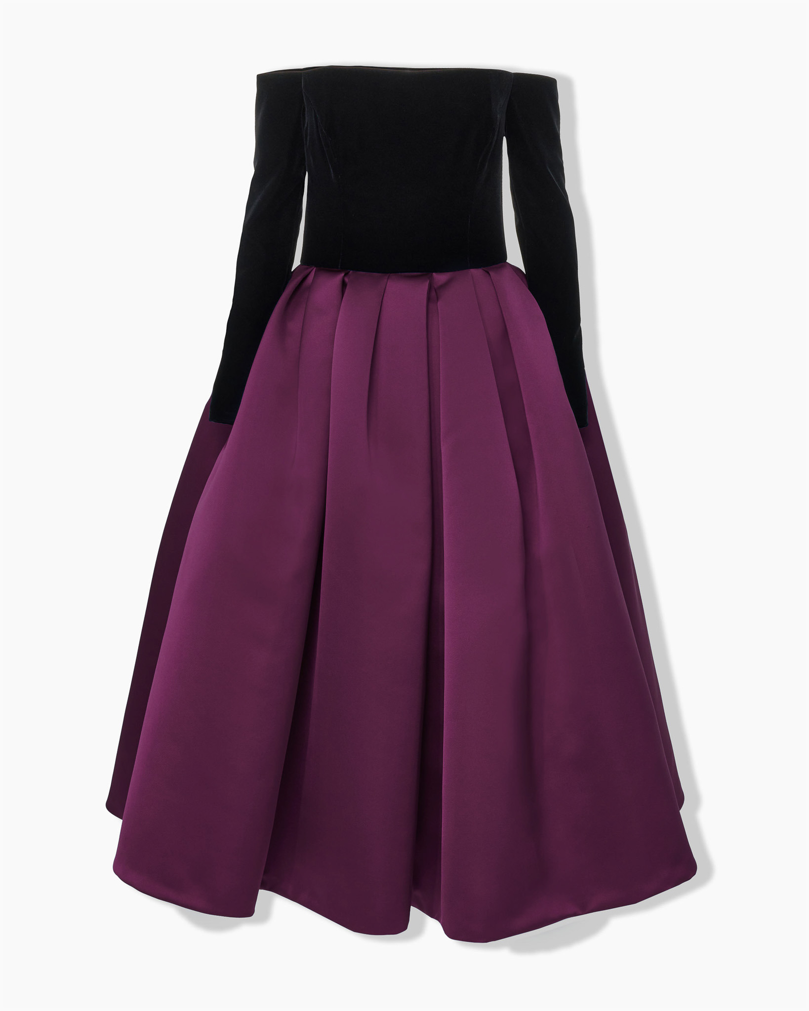 This off-the-shoulder midi dress boasts a mixed media construction, with a stretch-crepe bodice and a satin skirt. An irregular, hand-pleated waist creates generous volume. Off-the-shoulder neckline Concealed zip closures at back and cuffs SKU F2511N565DSA SIZE & FIT Close-fitting bodice, voluminous skirt Midweight satin Model is 179cm/ 5’11” and is wearing a US 2 Bust: 29.5" Waist: 22" Hips: 34.5" COMPOSITION & CARE 100% Polyester Washing Instructions Dry Clean Only Made in United States of America