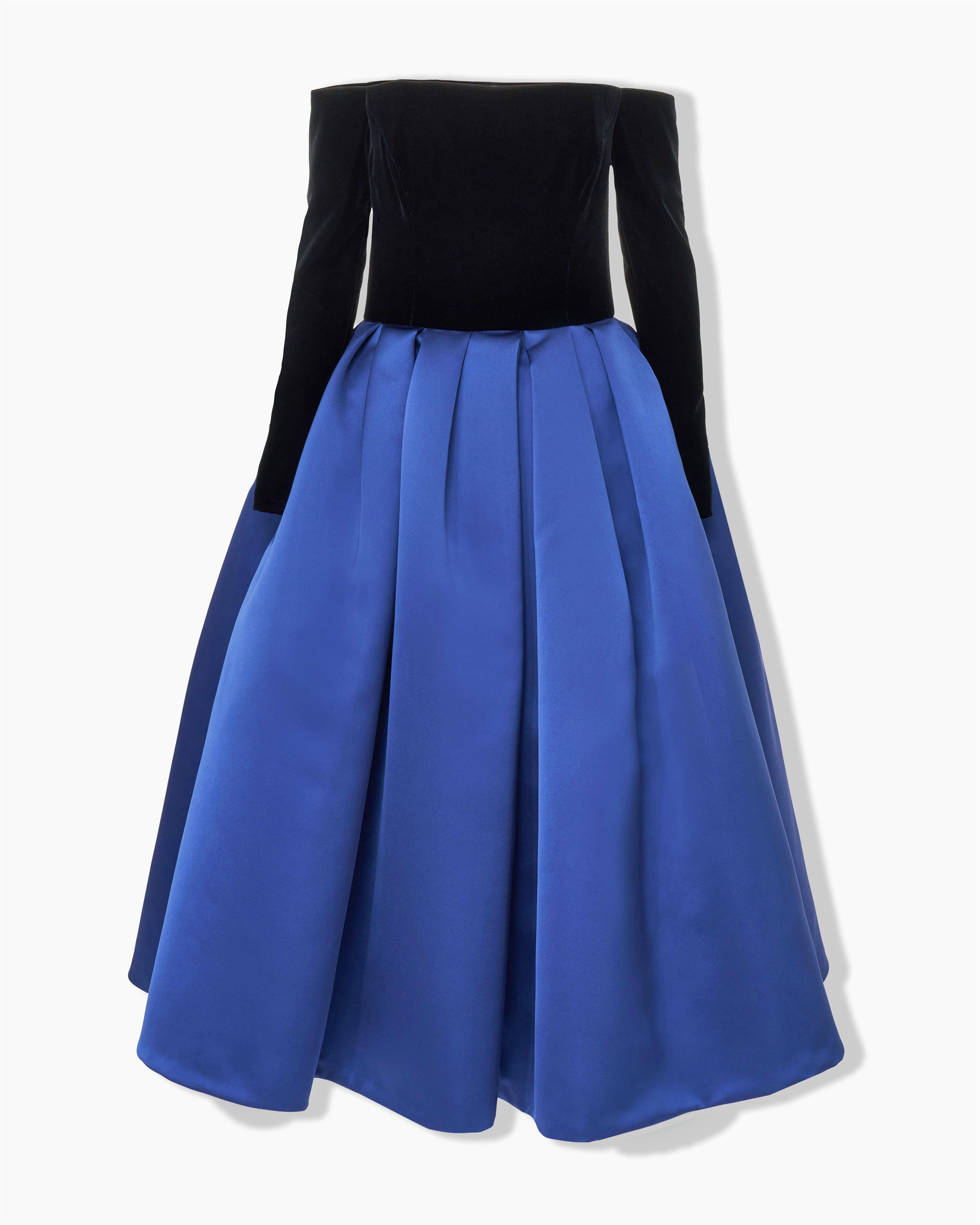 This off-the-shoulder midi dress boasts a mixed media construction, with a stretch-crepe bodice and a satin skirt. An irregular, hand-pleated waist creates generous volume. Off-the-shoulder neckline Concealed zip closures at back and cuffs SKU F2511N565DSA SIZE & FIT Close-fitting bodice, voluminous skirt Midweight satin Model is 179cm/ 5’11” and is wearing a US 2 Bust: 29.5" Waist: 22" Hips: 34.5" COMPOSITION & CARE 100% Polyester Washing Instructions Dry Clean Only Made in United States of America