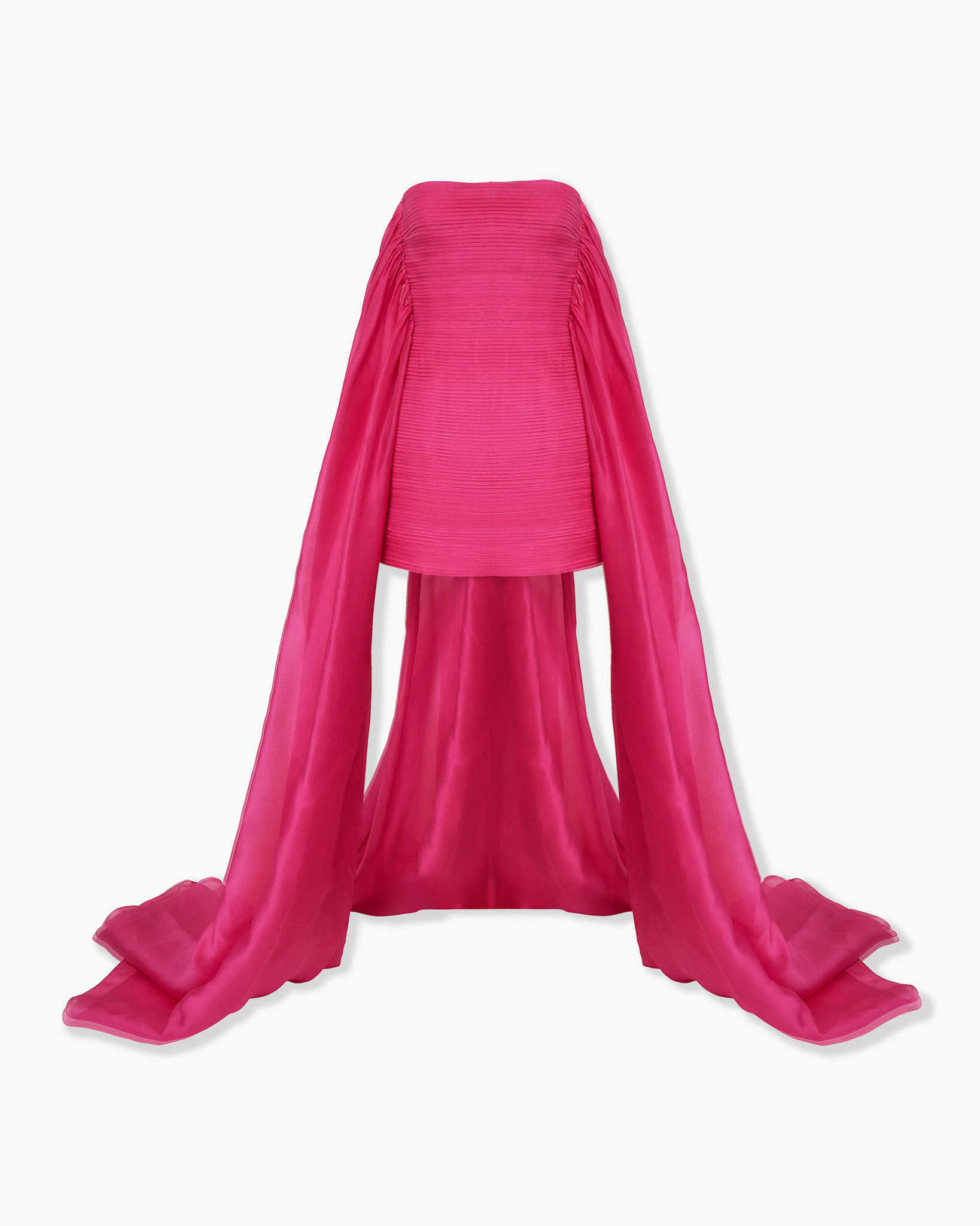 This silk-organza mini dress captivated on the runway with its bold pink hue and dramatic flowing train. The strapless bodice is detailed with horizontal pintuck pleats that release into a voluminous cascade at the sides. Runway style SKU F2511E737CRG SIZE & FIT Fitted bodice, voluminous cape Lightweight silk-crepe Model is 179cm/ 5’11” and is wearing a US 2 Bust: 29.5" Waist: 22" Hips: 34.5" COMPOSITION & CARE 100% Silk Washing Instructions Dry Clean Only Made in United States of America