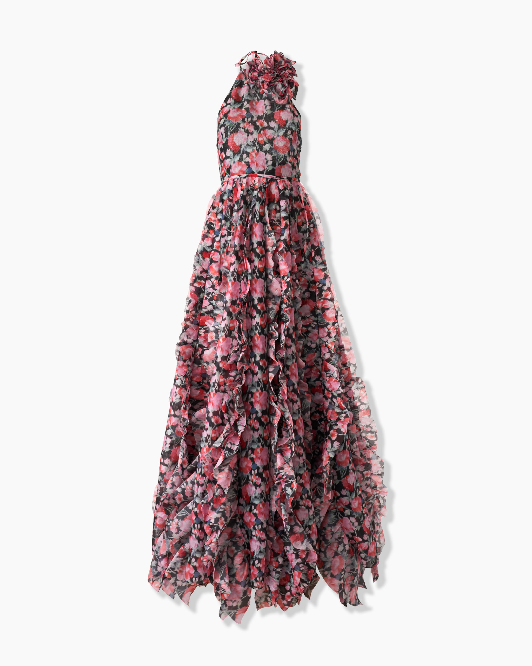 Playful ruffles cascade down the length of this peony-print gown, crafted of lightweight crepe-organza. A dimensional florette accents the chest, while the cutout back reveals an alluring flash of skin. Cutout back SKU P2511E703PCO SIZE & FIT Fitted bodice, loose maxi hem Lightweight crepe Model is 178cm/ 5’10” and is wearing a US 2 Bust: 31" Waist: 23" Hips: 34" COMPOSITION & CARE 100% Silk Washing Instructions Dry Clean Only Made in United States of America