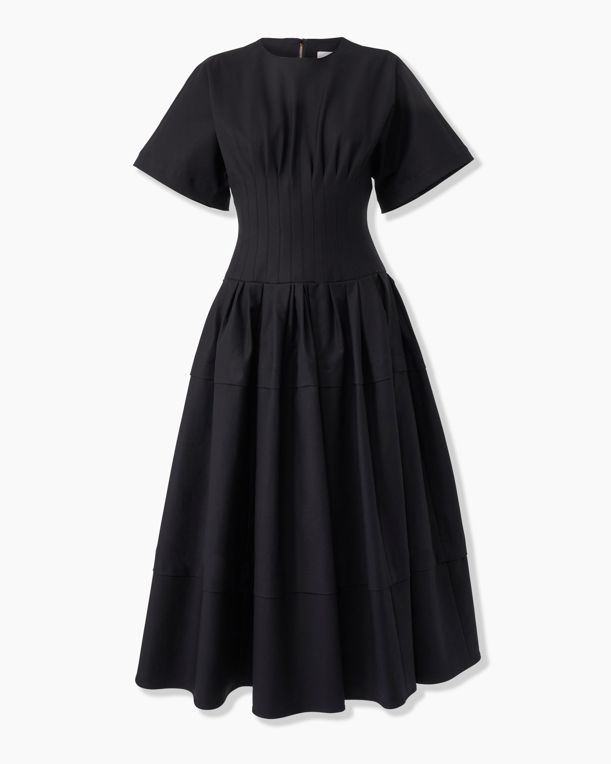This stretch-cotton sateen dress is tailored with a pleated waist which releases at the hips, giving the skirt generous volume. Exposed zip fastening at the back SKU P2511N534STS SIZE & FIT Slim fit bodice, A-line midi skirt Midweight stretch-cotton Model is 178cm/ 5’10” and is wearing a US 2 Bust: 31" Waist: 23" Hips: 34" COMPOSITION & CARE 95% Cotton 5% Elastane Washing Instructions Dry Clean Only Made in United States of America