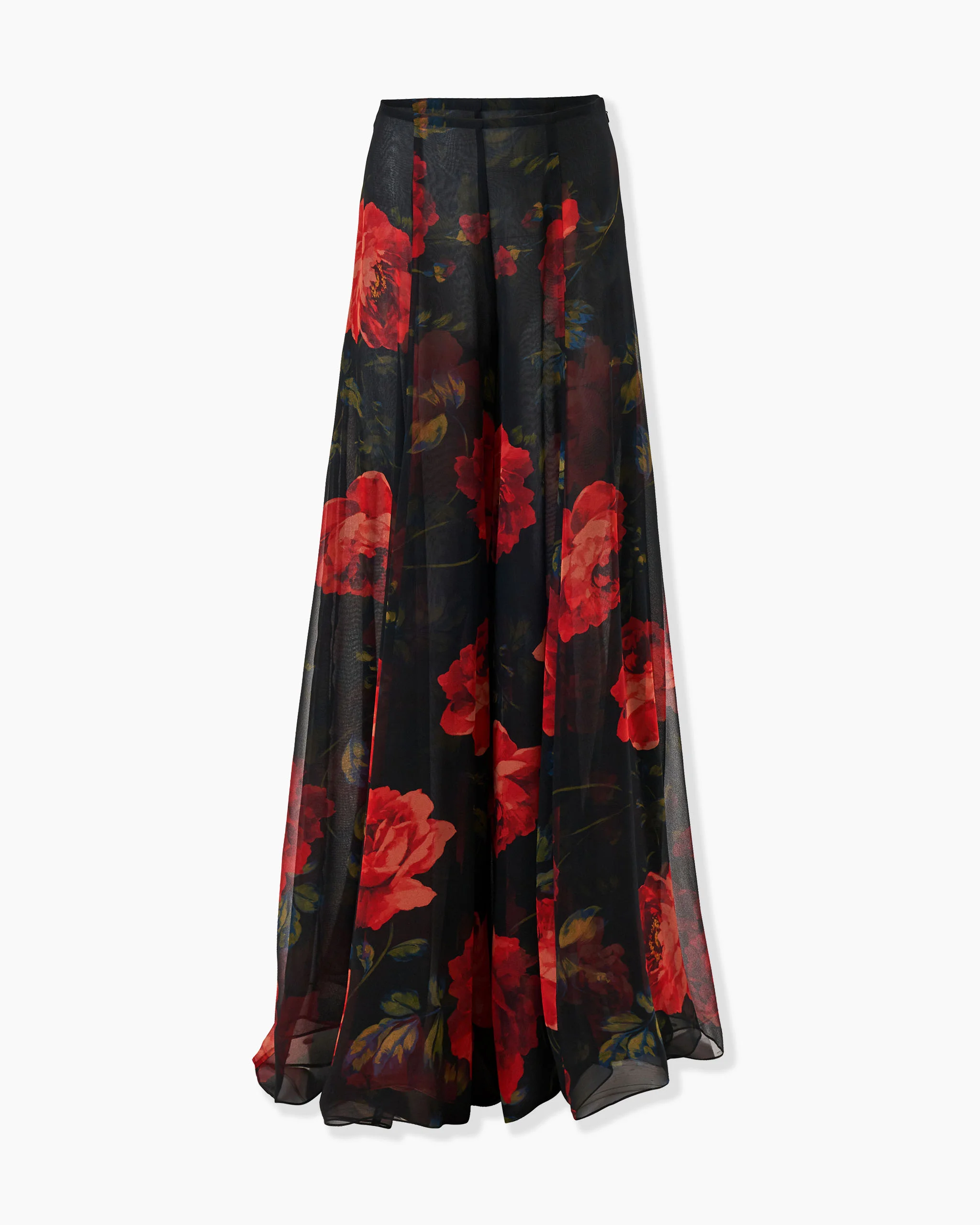 These high-waisted pants are cut from layers of silk chiffon in a billowing, floor-length silhouette that moves with graceful fluidity. Printed with red roses inspired by the paintings of Gabriel de la Corte, they pay tribute to the romance of Madrid. SKU S2611N406SMF SIZE & FIT High-rise, wide-leg fit Lightweight stemmed-rose print chiffon Model is 175cm/ 5’7” and is wearing a US 2 Bust: 30.5" Waist: 24" Hips: 34.5" COMPOSITION & CARE 100% Silk Washing Instructions Dry Clean Only Made in United States of America