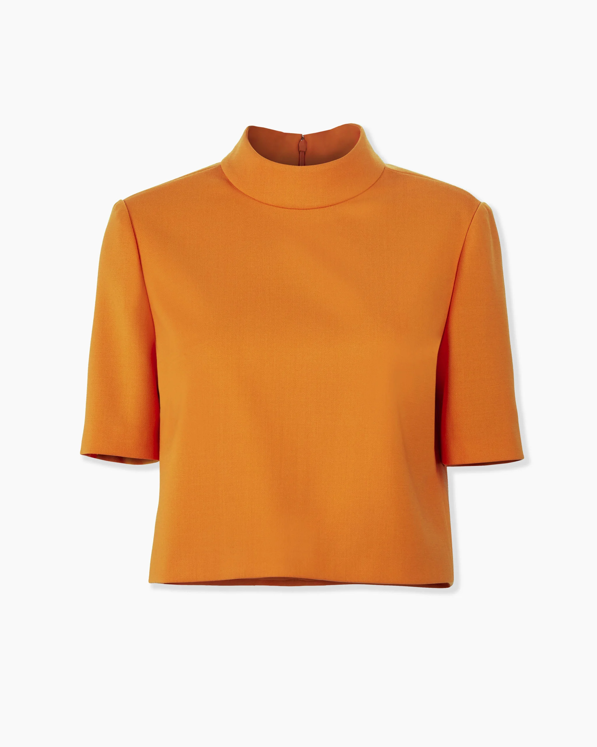 A mock turtleneck brings refined elegance to this short-sleeve top, tailored from Italian bi-stretch wool in a vibrant, Aegean-inspired hue. Pair it with the matching pants for a chic monochromatic look. SKU R2611N212BWT SIZE & FIT Regular fit Heavyweight stretch-wool Model is 178cm/ 5’10” and is wearing a US 2 Bust: 32" Waist: 23" Hips: 34" COMPOSITION & CARE 97% Wool 3% Elastane Washing Instructions Dry Clean Only Made in Italy