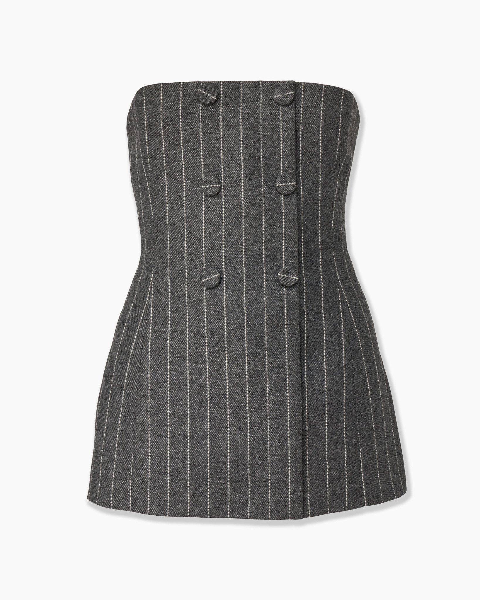 This strapless top is cut from pinstripe flannel in a double-breasted design, blending a feminine silhouette with classic tailoring. Pair it with matching pinstripe pants from the collection. Runway style Decorative buttons SKU F2511N200PFN SIZE & FIT Slim fit Midweight stretch-flannel Model is 179cm/ 5’11” and is wearing a US 2 Bust: 29.5" Waist: 22" Hips: 34.5" COMPOSITION & CARE 46% Reinforced Woven, 36% Linen/Viscose Blend, 17% Recycled Nylon, 1% Elastane Washing Instructions Dry Clean Only Made in Italy