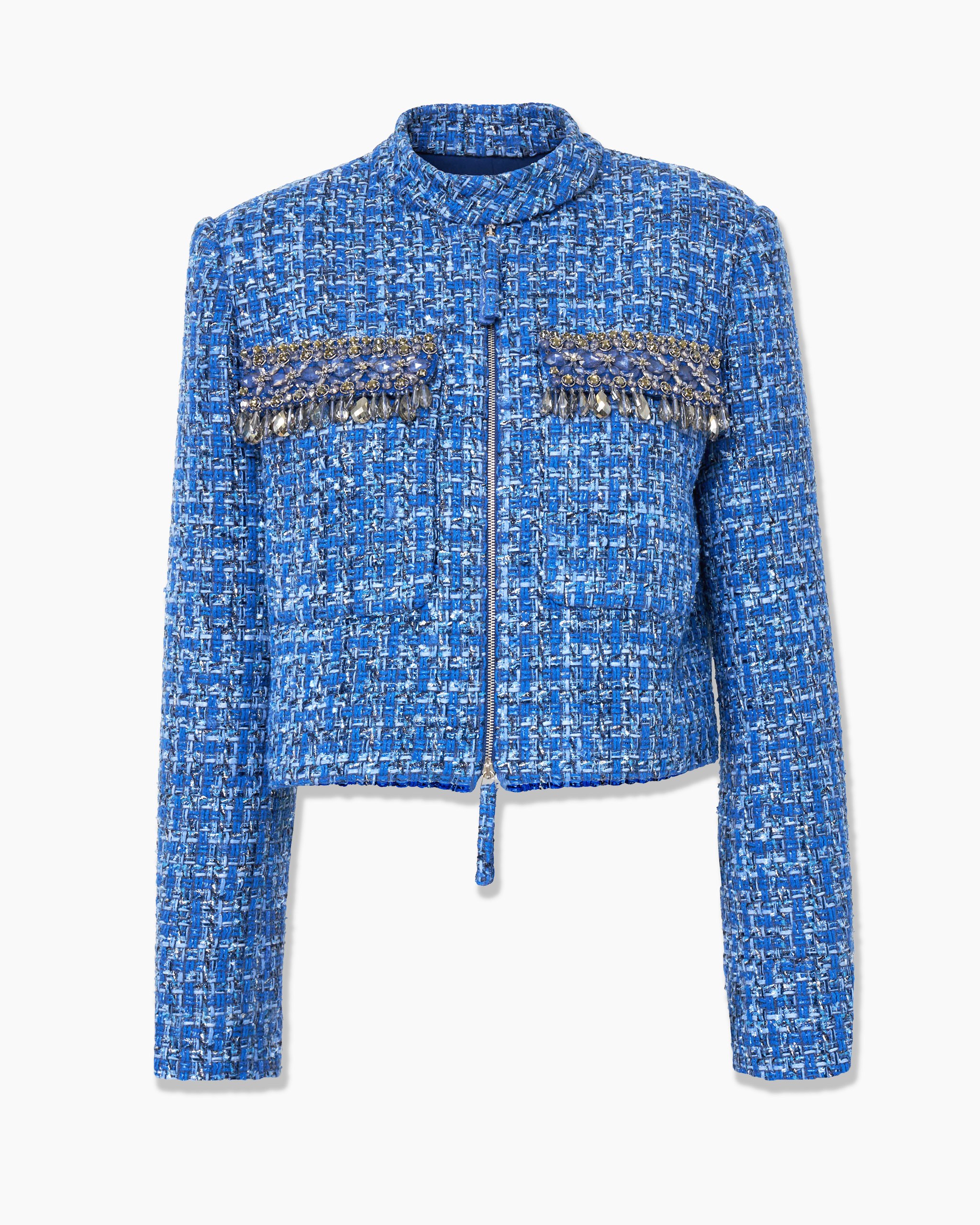 This chic cropped jacket is tailored in foiled tweed woven in a rich melange of blue tones. The hem and cuffs are embellished with smoky-hued crystals, adding a luxurious accent. Runway style Zip closure at the front SKU F2511E105FTD SIZE & FIT Regular fit Midweight tweed Model is 178cm/ 5’10” and is wearing a US 2 Bust: 29" Waist: 23" Hips: 34.5" COMPOSITION & CARE 28% Nylon, 21% Polyester, 20% Cotton, 14% Virgin Wool, 10% Viscose, 7% Acrylic Washing Instructions Dry Clean Only Made in Italy