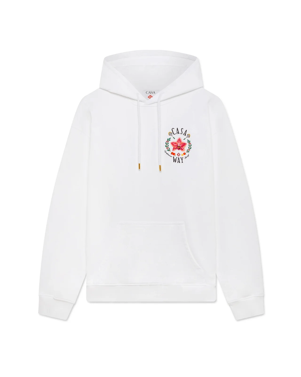 The Casa Way Orchid hooded sweatshirt is a refined long-sleeve design featuring the season's Casa Way Orchid artwork, exploring digital art through the continuation of the dialogue between technology and nature. Completed with a hood, drawstring fastening, and ribbed cuffs and hem detail. - Loopback cotton fabric - 100% organic cotton - Embroidery: 100% viscose - Colour: white - Delicate machine wash - Made in Portugal - Relaxed fit - The model is 186cm/6'1 and is wearing a size M - Exclusive to casablancaparis.com