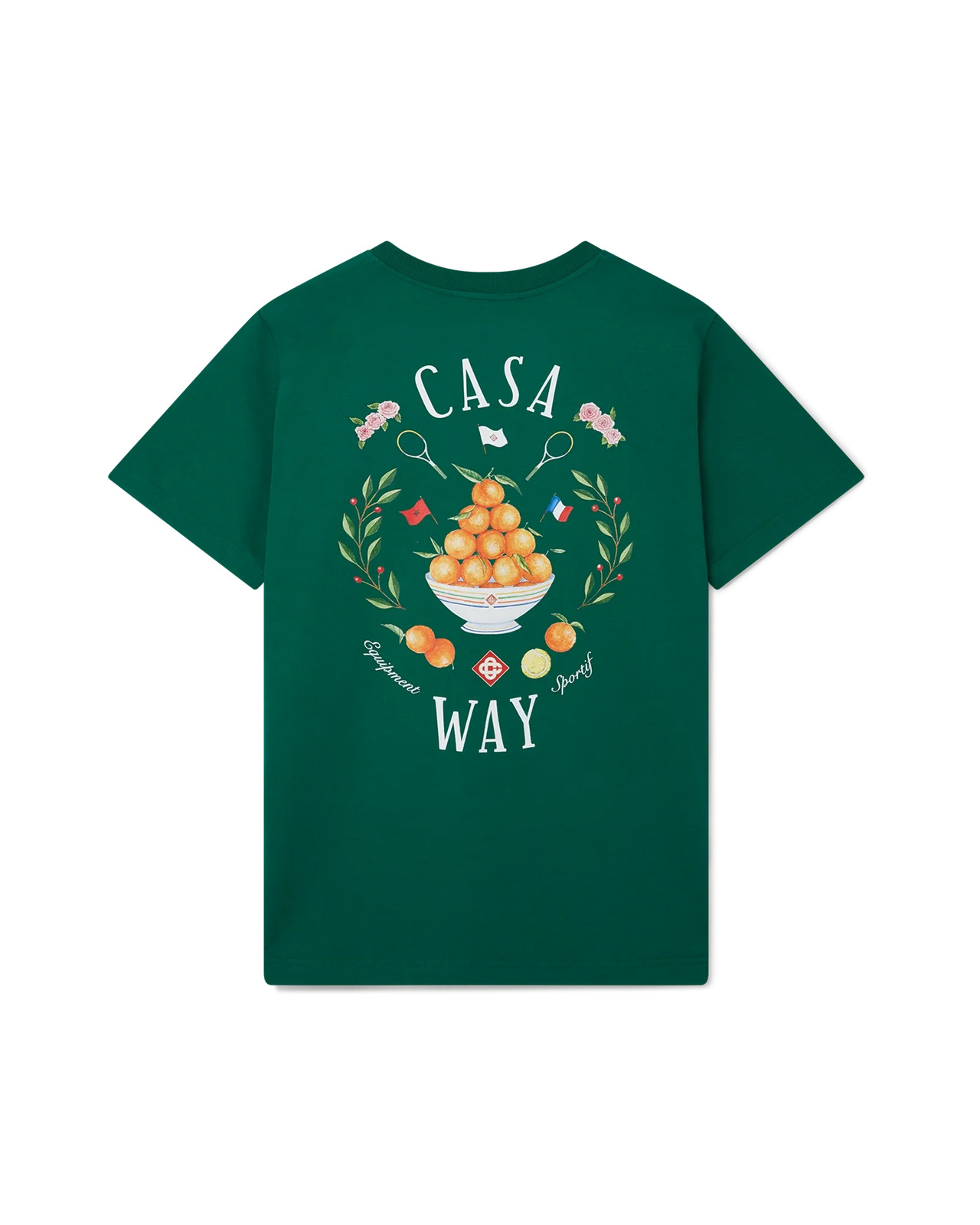 The Casa Way t-shirt features a print of the house's classic iconographic artwork featuring the orange pyramid, tennis rackets and floral design repeated in a larger print on the back. Crafted from 100% organic cotton and completed with a classic crewneck and Casablanca branded label. - 100% organic cotton - Colour: evergreen - Delicate machine wash - Made in Portugal - Fits true to size, take your regular size