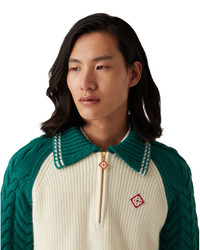 The cashmere cable knit jumper is a long-sleeve textured design crafted from a cashmere blend fabric. Completed with the house's signature diamond logo, a quarter zip closure, rib collar, cuffs, and hem, contrast collar and cable knit raglan sleeves with white stripe edge details. - Cashmere blend fabric - Main: 70% wool 30% cashmere - Contrast: 100% merino wool - Colour: green/white - Specialised dry clean only - Fits true to size, take your regular size - The model is 187cm/6'1 and is wearing a size M