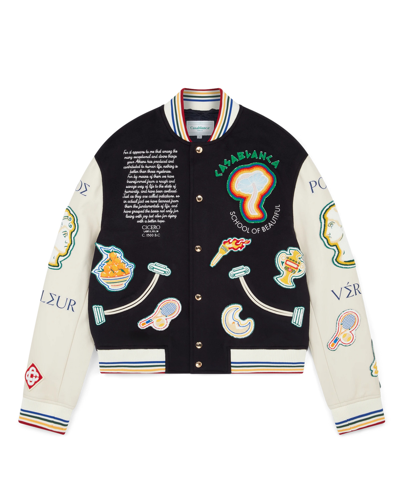 The chenille patchwork bomber jacket is a traditional bomber-style jacket featuring iconographies used throughout previous collections, crafted from virgin wool and leather with Greek letter embroidery featuring ancient Greek influence intertwined with futuristic elements and the house's signature design elements such as the Laurel leaf artwork, a tennis racket and ball, and oranges, and an olympic torch. Completed with seasonal motifs of ancient Greece, pocket openings created by a curved Ionic column, button closure with gold-plated branded hardware, a rib stand up collar, cuffs and hem with multicolour stripe detail. - Wool and leather fabric - Main: 100% wool - Lining: 52% viscose 48% cotton - Contrast 1: 100% lamb nappa - Contrast 2: 90% polyester 10% elastane - Colour: navy, off-white - Specialised dry clean only - Fit true to size, take your regular size - The model is 187cm/6’1 and is wearing a size M